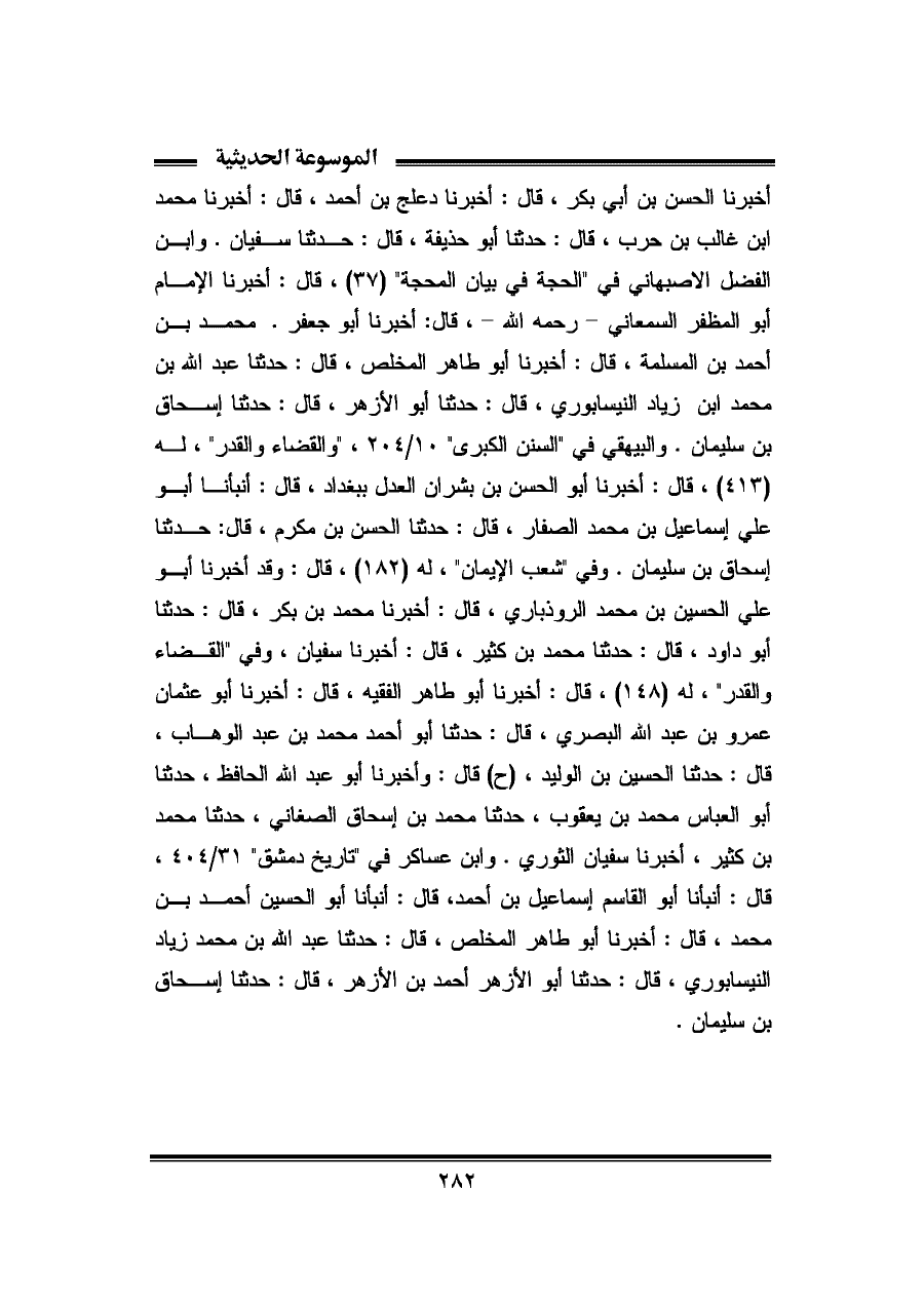 أخبرنا الحسن بن أبي بكر، قال: أخبرنا دعلج بن أحمد، قال: أخبرنا محمد بن غالب بن حرب، قد: حدثنا أبو حذيفة، قال: حدثنا سفيان. وابن الفضل الأصبهاني في "الحجة في بيان المحجة" (٣٧)، قال: أخبرنا الإمام أبو المظفر السمعاني - رحمه الله -، قال: أخبرنا أبو جعفر. محمد بن أحمد بن المسلمة، قال: أخبرنا أبو طاهر المخلص، قال: حدثنا عبد الله بن محمد بن زياد النيسابورى، قال: حدثنا أبو الأزهر، قال: حدثنا إسحاق بن سليمان. والبيهقي في "السنن الكبرى" ١٠/ ٢٠٤، "والقضاء والقدر"، له (٤١٣)، قال: أخبرنا أبو الحسن بن بشران العدل ببغداد، قال: أنبأنا أبو علي إسماعيل بن محمد الصفار، قال: حدثنا الحسن بن مكرم، قال: حدثنا إسحاق بن سليمان. وفي "شعب الإيمان"، له (١٨٢)، قال: وقد أخبرنا أبو علي الحسين بن محمد الروذباري، قال: أخبرنا محمد بن بكر، قال: حدثنا أبو داود، قال: حدثنا محمد بن كثير، قال: أخبرنا سفيان، وفي "القضاء والقدر"، له (١٤٨)، قال: أخبرنا أبو طاهر الفقيه، قال: أخبرنا أبو عثمان عمرو بن عبد الله البصري، قال: حدثنا أبو أحمد محمد بن عبد الوهاب، قال: حدثنا الحسين بن الوليد، (ح) قال: وأخبرنا أبو عبد الله الحافظ، حدثنا أبو العباس محمد بن يعقوب، حدثنا محمد بن إسحاق الصغاني، حدثنا محمد بن كثير، أخبرنا سفيان الثوري. وابن عساكر في "تاريخ دمشق" ٣١/ ٤٠٤، قال: أنبأنا أبو القاسم إسماعيل بن أحمد، قال: أنبأنا أبو الحسين أحمد بن محمد، قال: أخبرنا أبو طاهر المخلص، قال: حدثنا عبد الله بن محمد زياد النيسابوري، قال: حدثنا أبو الأزهر أحمد بن الأزهر، قال: حدثنا إسحاق بن سليمان.