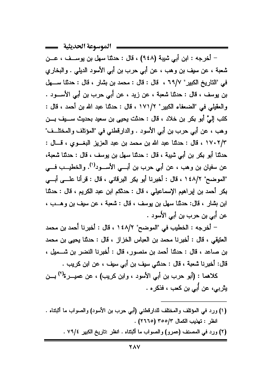- أخرجه: ابن أبي شيبة (٩٤٨)، قال: حدثنا سهل بن يوسف، عن شعبة، عن سيف بن وهب، عن أبي حرب بن أبي الأسود الديلى. والبخاري في "التاريخ الكبير" ٧/ ٦٩، قال: قال: محمد بن بشار، قال: حدثنا سهل بن يوسف، قال: حدثنا شعبة، عن زيد، عن أبي حرب بن أبي الأسود. والعقيلي في "الضعفاء الكبير" ٢/ ١٧١، قال: حدثنا عبد الله بن أحمد، قال: كتب إليّ أبو بكر بن خلاد، قال: حدثت يحيى بن سعيد بحديث سيف بن وهب، عن أبي حرب بن أبي الأسود. والدارقطني في "المؤتلف والمختلف" ٣/ ١٧٠٢، قد: حدثنا عبد الله بن محمد بن عبد العزيز البغوي، قال: حدثنا أبو بكر بن أبي شيبة، قال: حدثنا سهل بن يوسف، قال: حدثنا شعبة، عن سفيان بن وهب، عن أبي حرب بن أبي الأسود (¬١). والخطيب في "الموضح" ٢/ ١٤٨، قال: أخبرنا أبو بكر البرقاني، قال: قرأنا على أبي بكر أحمد بن إبراهيم الإسماعيلي، قال: حدثكم ابن عبد الكريم، قال: حدثنا ابن بشار، قال: حدثنا سهل بن يوسف، قال: شعبة، عن سيف بن وهب، عن أبي بن حرب بن أبي الأَسود.