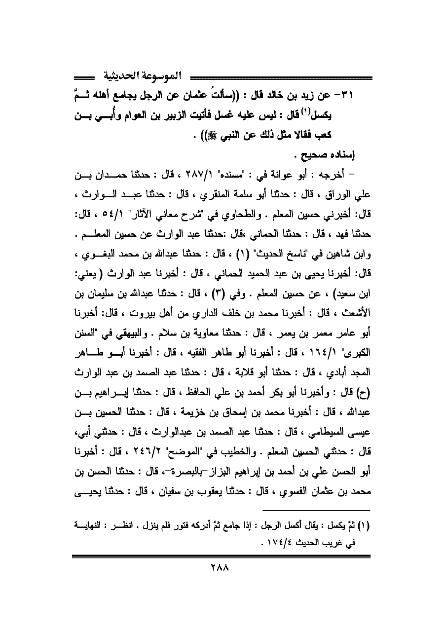 ٣١ - عن زيد بن خالد قال: ((سألتُ عثمان عن الرجل يجامع أهله ثمَّ يكسل (¬١) قال: ليس عليه غسل فأتيت الزبير بن العوام وأُبي بن كعب فقالا مثل ذلك عن النبيِّ - صلى الله عليه وسلم -)).