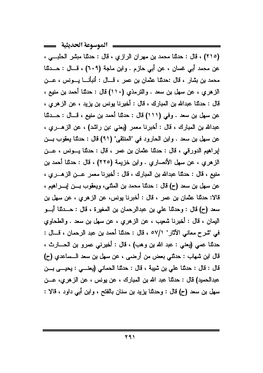 (٢١٥)، قال: حدثنا محمد بن مهران الرازي، قال: حدثنا مبشر الحلبي، عن محمد أبي غسان، عن أبي حازم. وابن ماجة (٦٠٩)، قال: حدثنا محمد بن بشار، قال: حدثنا عثمان بن عمر، قال: أنبأنا يونس، عن الزهري، عن سهل بن سعد. والترمذي (١١٠) قال: حدثنا أحمد بن منيع، قال: حدثنا عبد الله بن المبارك، قال: أخبرنا يونس بن يزيد، عن الزهري، عن سهل بن سعد. وفي (١١١) قال: حدثنا أحمد بن منيع، قال: حدثنا عبد الله بن المبارك، قال: أخبرنا معمر (يعني: بن راشد)، عن الزهري، عن سهل بن سعد. وابن الحارود في "المنتقى" (٩١) قال: حدثنا يعقوب بن إبراهيم الدورقي، قال: حدثنا عثمان بن عمر، قال: حدثنا يونس، عن الزهرى، عن سهل الأنصاري. وابن خزيمة (٢٢٥)، قال: حدثنا أحمد بن منيع، قال: حدثنا عبد الله بن المبارك، قال: أخبرنا معمر عن الزهري، عن سهل بن سعد (ح) قال: حدثنا محمد بن المثنى، ويعقوب بن إبراهيم، قالا: حدثنا عثمان بن عمر، قال: أخبرنا يونس، عن الزهري، عن سهل بن سعد (ح) قال: وحدثنا علي بن عبد الرحمان بن المغيرة، قال: حدثنا أبو اليمان، قال: أخبرنا شعيب، عن الزهري، عن سهل بن سعد. والطحاوي في "شرح معاني الآثار" ١/ ٥٧، قال: حدثنا أحمد بن عبد الرحمان، قال: حدثنا عمي (يعني: عبد الله بن وهب)، قال: أخبرني عمرو بن الحارث، قال ابن شهاب: حدثني بعض من أرضى، عن سهل بن سعد الساعدي (ح) قال: قال: حدثنا علي بن شيبة، قال: حدثنا الحماني (يعني: يحيى بن عبد الحميد) قال: حدثنا عبد الله بن المبارك، عن يونس، عن الزهري، عن سهل بن سعد (ح) قال: وحدثنا يزيد بن سنان بالفتح، وابن أبي داود، قالا: