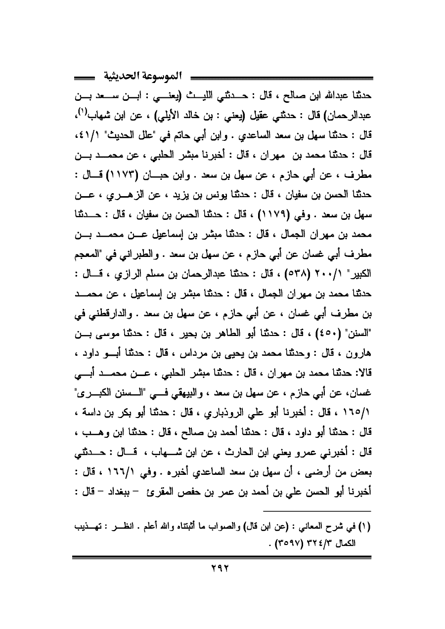 حدثنا عبد الله بن صالح، قال: حدثني الليث (يعني: ابن سعد بن عبد الرحمان) قال: حدثني عقيل (يعني: بن خالد الأيلي)، عن ابن شهاب (¬١)، قال: حدثنا سهل بن سعد الساعدي. وابن أبي حاتم في "علل الحديث" ١/ ٤١، قال: حدثنا محمد بن مهران، قال: أخبرنا مبشر الحلبي، عن محمد بن مطرف، عن أبي حازم، عن سهل بن سعد. وابن حبان (١١٧٣) قال: حدثنا الحسن بن سفيان، قال: حدثنا يونس بن يزيد، عن الزهرى، عن سهل بن سعد. وفي (١١٧٩)، قال: حدثنا الحسن بن سفيان، قال: حدثنا محمد بن مهران الجمال، قال: حدثنا مبشر بن إسماعيل عن محمد بن مطرف أبي غسان عن أبي حازم، عن سهل بن سعد. والطبراني في "المعجم الكبير" ١/ ٢٠٠ (٥٣٨)، قال: حدثنا عبد الرحمان بن مسلم الرازى، قال: حدثنا محمد بن مهران الجمال، قال: حدثنا مبشر بن إسماعيل، عن محمد بن مطرف أبي غسان، عن أبي حازم، عن سهل بن سعد. والدارقطني في "السنن" (٤٥٠)، قال: حدثنا أبو الطاهر بن بحير، قال: حدثنا موسى بن هارون، قال: وحدثنا محمد بن يحيى بن مرداس، قال: حدثنا أبو داود، قالا: حدثنا محمد بن مهران، قال: حدثنا مبشر الحلبي، عن محمد أبي غسان، عن أبي حازم، عن سهل بن سعد، والبيهقي في "السنن الكبرى" ١/ ١٦٥، قال: أخبرنا أبو علي الروذباري، قال: حدثنا أبو بكر بن داسة، قال: حدثنا أبو داود، قال: حدثنا أحمد بن صالح، قال: حدثنا ابن وهب، قال: أخبرني عمرو يعني ابن الحارث، عن ابن شهاب، قال: حدثني بعض من أرضى، أن سهل بن سعد الساعدي أخبره. وفي ١/ ١٦٦، قال: أخبرنا أبو الحسن علي بن أحمد بن عمر بن حفص المقرئ - ببغداد - قال: