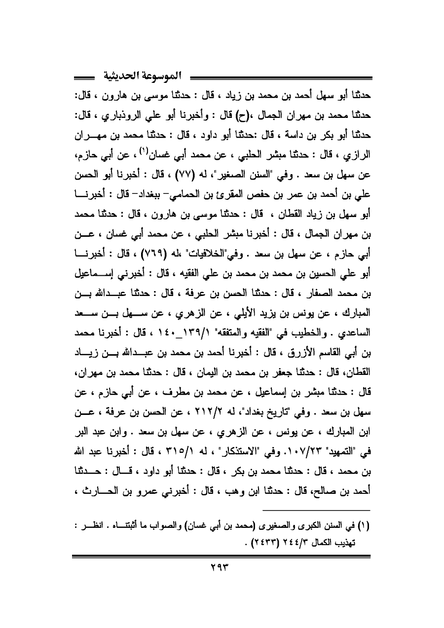 حدثنا أبو سهل أحمد بن محمد بن زياد، قال: حدثنا موسى بن هارون، قال: حدثنا محمد بن مهران الجمال، (ح) قال: وأخبرنا أبو علي الروذباري، قال: حدثنا أبو بكر بن داسة، قال: حدثنا أبو داود، قال: حدثنا محمد بن مهران الرازي، قال: حدثنا مبشر الحلبي، عن محمد أبي غسان (¬١)، عن أبي حازم، عن سهل بن سعد. وفي "السنن الصغير"، له (٧٧)، قال: أخبرنا أبو الحسن علي بن أحمد بن عمر بن حفص المقرئ بن الحمامي - ببغداد - قال: أخبرنا أبو سهل بن زياد القطان، قال: حدثنا موسى بن هارون، قال: حدثنا محمد بن مهران الجمال، قال: أخبرنا مبشر الحلبي، عن محمد أبي غسان، عن أبي حازم، عن سهل بن سعد. وفي "الخلافيات"، له (٧٦٩)، قال: أخبرنا أبو علي الحسين بن محمد بن محمد بن علي الفقيه، قال: أخبرني إسماعيل بن محمد الصفار، قال: حدثنا الحسن بن عرفة، قال: حدثنا عبد الله بن المبارك، عن يونس بن يزيد الأيلي، عن الزهري، عن سهل بن سعد الساعدي. والخطيب في "الفقيه والمتفقه" ١/ ١٣٩ - ١٤٠، قال: أخبرنا محمد بن أبي القاسم الأزرق، قال: أخبرنا أحمد بن محمد بن عبد الله بن زياد القطان، قال: حدثنا جعفر بن محمد بن اليمان، قال: حدثنا محمد بن مهران، قال: حدثنا مبشر بن إسماعيل، عن محمد بن مطرف، عن أبي حازم، عن سهل بن سعد. وفي "تاريخ بغداد"، له ٢/ ٢١٢، عن الحسن بن عرفة، عن ابن المبارك، عن يونس، عن الزهري، عن سهل بن سعد. وابن عبد البر في "التمهيد" ٢٣/ ١٠٧. وفي "الاستذكار"، له ١/ ٣١٥، قال: أخبرنا عبد الله بن محمد، قال: حدثنا محمد بن بكر، قال: حدثنا أبو داود، قال: حدثنا أحمد بن صالح، قال: حدثنا ابن وهب، قال: أخبرني عمرو بن الحارث،