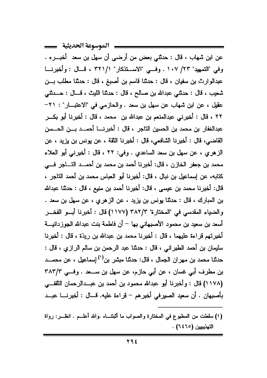 عن ابن شهاب، قال: حدثني بعض من أرضى أن سهل بن سعد أخبره. وفي "التمهيد" ٢٣/ ١٠٧. وفي "الاستذكار" ١/ ٣٢١، قال: وأخبرنا عبد الوارث بن سفيان، قال: حدثنا قاسم بن أصبغ، قال: حدثنا مطلب بن شعيب، قال: حدثني عبد الله بن صالح، قال: حدثنا الليث، قال: حدثني عقيل، عن ابن شهاب عن سهل بن سعد. والحازمي في "الاعتبار": ٢١ - ٢٢، قال: أخبرني عبد المنعم بن عبد الله بن محمد، قال: أخبرنا أبو بكر عبد الغفار بن محمد بن الحسين التاجر، قال: أخبرنا أحمد بن الحسن القاضي، قال: أخبرنا الشافعي، قال: أخبرنا الثقة، عن يونس بن يزيد، عن الزهري، عن سهل بن سعد الساعدي. وفي: ٢٢، قال: أخبرني أبو العلاء محمد بن جعفر الخازن، قال: أخبرنا أحمد بن محمد بن أحمد التاجر في كتابه، عن إسماعيل بن نبال، قال: أخبرنا أبو العباس محمد بن أحمد التاجر، قال: أخبرنا محمد بن عيسى، قال: أخبرنا أحمد بن منيع، قال: حدثنا عبد الله بن المبارك، قال: حدثنا يونس بن يزيد، عن الزهري، عن سهل بن سعد. والضياء المقدسي في "المختارة" ٣/ ٣٨٢ (١١٧٧) قال: أخبرنا أبو الفخر أسعد بن سعيد بن محمود الأصبهاني بها - أن فاطمة بنت عبد الله الجوزدانية أخبرتهم قراءة عليهما، قال: أخبرنا محمد بن عبد الله بن ريذة، قال: أخبرنا سليمان بن أحمد الطبراني، قال: حدثنا عبد الرحمن بن سالم الرازي، قال: حدثنا محمد بن مهران الجمال، قال: حدثنا مبشر بن (¬١) إسماعيل، عن محمد بن مطرف أبي غسان، عن أبي حازم، عن سهل بن سعد. وفي ٣/ ٣٨٣ (١١٧٨) قال: وأخبرنا أبو عبد الله محمود بن أحمد بن عبد الرحمان الثقفي بأصبهان. أن سعيد الصيرفي أخبرهم - قراءة عليه. قال: أخبرنا عبد
