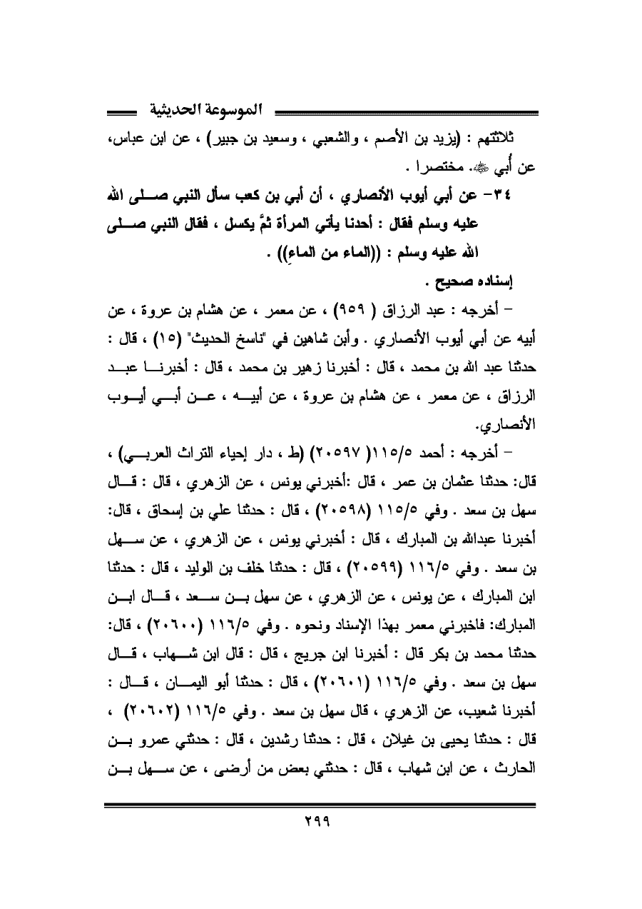 ٣٤ - عن أبى أيوب الأنصاري، أن أبى بن كعب سأل النبي صلى الله عليه وسلم فقال: أحدنا يأتى المرأة ثمَّ يكسل، فقال النبي صلى الله عله وسلم: ((الماء من الماءِ)).