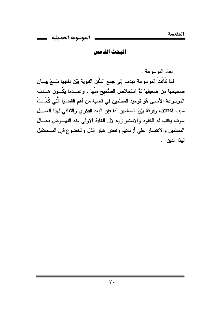 لما كَانَتْ الموسوعة تهدف إلى جمع السُّنَن النبوية بَيْنَ دفتيها مَعَ بيان صحيحها من ضعيفها ثمَّ استخلاص الصَّحِيح مِنْها، وعندما يَكُون هدف الموسوعة الأسمى هُوَ توحيد المسلمين في قضية من أهم القضايا الَّتِي كَانَتْ سبب اختلاف وفرقة بَيْنَ المسلمين لذا فإن البعد الفكري والثقافي لهذا العمل سوف يكتب له الخلود والاستمرارية لأن الغاية الأولى منه النهوض بحال المسلمين والانتصار على أزماتهم ونفض غبار الذل والخضوع فإن المستقبل لهذا الدين.