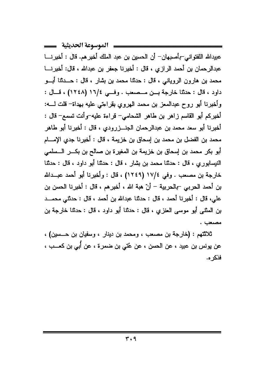 عبيد الله اللفتواني - بأصبهان - أن الحسين بن عبد الملك أخبرهم. قال: أخبرنا عبد الرحمان بن أحمد الرازي، قال: أخبرنا جعفر بن عبد الله، قال: أخبرنا محمد بن هارون الروياني، قال: حدثنا محمد بن بشار، قال: حدثنا أبو داود، قال: حدثنا خارجة بن مصعب. وفي ٤/ ١٦ (١٢٤٨)، قال: وأخبرنا أبو روح عبد المعز بن محمد الهروي بقراءتي عليه بهداة - قلت له: أخبركم أبو القاسم زاهر بن طاهر الشحامي - قراءة عليه - وأنت تسمع - قال: أخبرنا أبو سعد محمد بن عبد الرحمان الجنزرودي، قال: أخبرنا أبو طاهر محمد بن الفضل بن محمد بن إسحاق بن خزيمة، قال: أخبرنا جدي الإمام أبو بكر محمد بن إسحاق بن خزيمة بن المغيرة بن صالح بن بكر السلمي النيسابوري، قال: حدثنا محمد بن بشار، قال: حدثنا أبو داود، قال: حدثنا خارجة بن مصعب. وفي ٤/ ١٧ (١٢٤٩)، قال: وأخبرنا أبو أحمد عبد الله بن أحمد الحربي - بالحربية - أنّ هبة الله، أخبرهم، قال: أخبرنا الحسن بن علي، قال: أخبرنا أحمد، قال: حدثنا عبد الله بن أحمد، قال: حدثني محمد بن المثنى أبو موسى العنزي، قال: حدثنا أبو داود، قال: حدثنا خارجة بن مصعب.