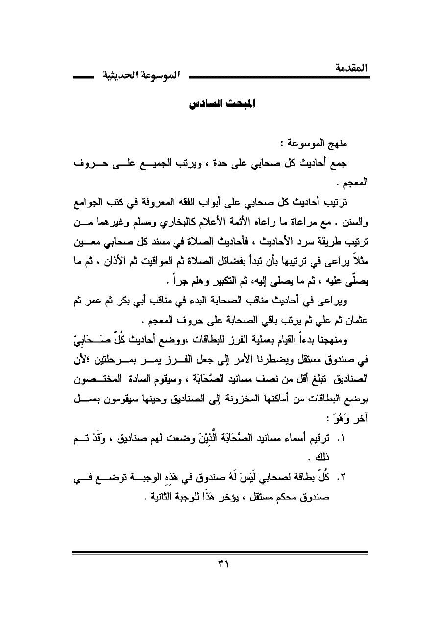 ومنهجنا بدءًا القيام بعملية الفرز للبطاقات، ووضع أحاديث كُلّ صَحَابِيّ في صندوق مستقل ويضطرنا الأمر إلى جعل الفرز يمر بمرحلتين؛ لأن الصناديق تبلغ أكل من نصص مسانيد الصَّحَابَة، وسيقوم السادة المختصون بوضع البطاقات من أماكنها المخزونة إلى الصناديق وحينها سيقومون بعمل آخر وَهُوَ: