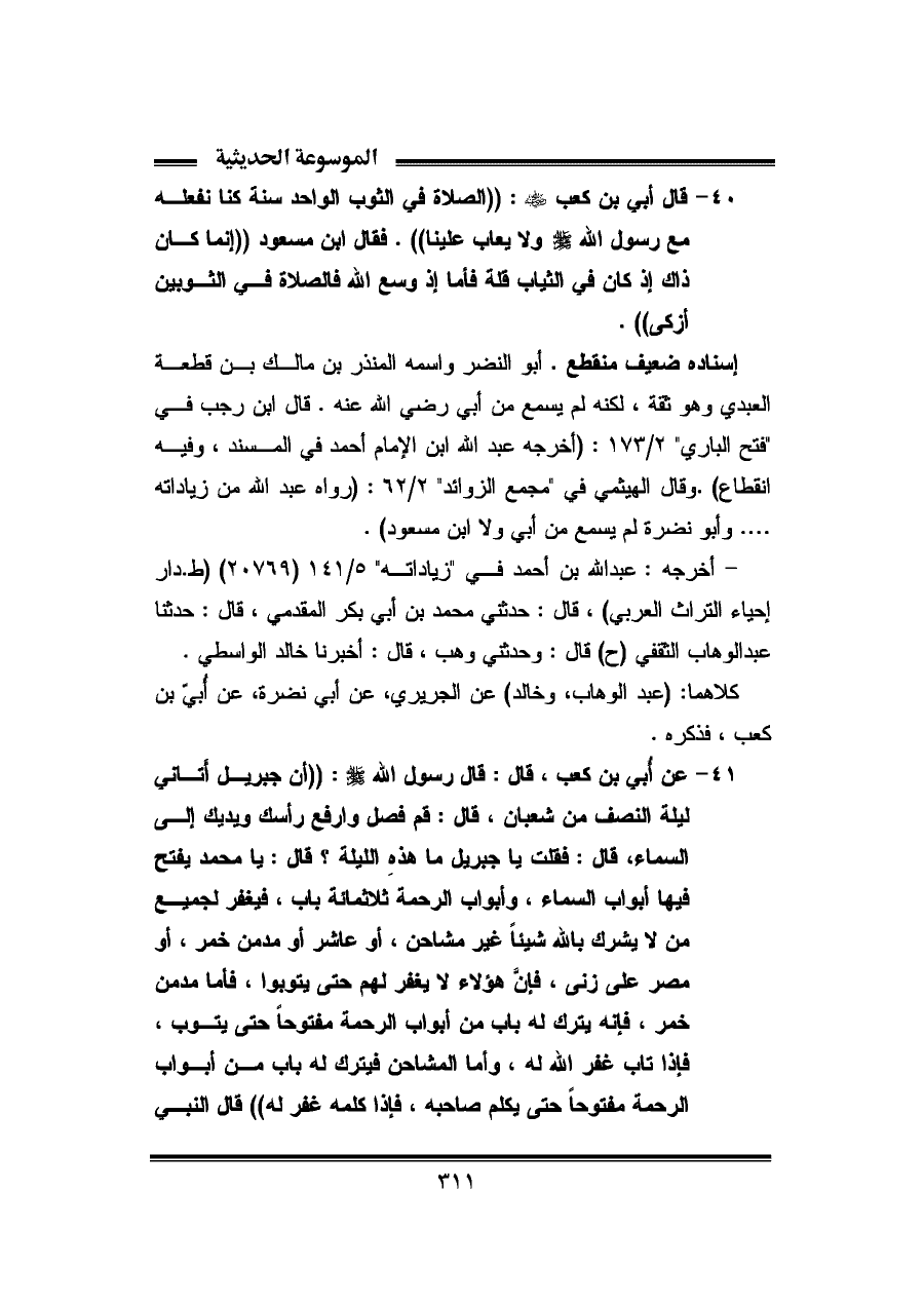 ٤١ - عن أَبى بن كعب، قال: قال رسول اللّه - صلى الله عليه وسلم -: "أَن جبريل أَتاني ليلة النصف من شعبان، قال: قم فصل وارفع رأسك ويديك إلى السماء، قال: فقلت يا جبريل ما هذهِ الليلة؟ قال: يا محمد يفتح فيها أبواب السماء، وأبواب الرحمة ثلاثمائة باب، فيغفر لجميع من لا يشرك بالله شيئًا غير مشاحن، أو عاشر أو مدمن خمر، أو مصر على زنى، فإنَّ هؤلاء لا يغفر لهم حتى يتوبوا، فأما مدمن خمر، فإنه يترك له باب من أبواب الرحمة مفتوحًا حتى يتوب، فإذا تاب غفر اللّه له، وأما المشاحن فيترك له باب من أبواب الرحمة مفتوحًا حتى يكلم صاحبه، فإذا كلمه غفر له" قال النبي