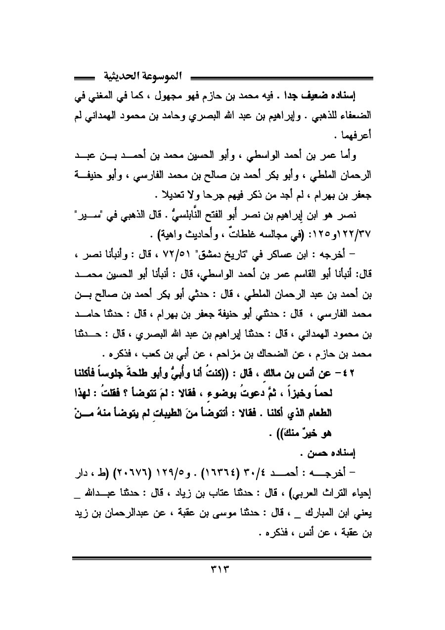 ٤٢ - عن أنس بن مالكٍ، قال: "كنتُ أنا وأُبيُّ وأبو طلحةَ جلوسًا فأكلنا لحمًا وخبزًا، ثمَّ دعوتُ بوضوءٍ، فقالا: لمَ تتوضأ؟ فعلتُ: لهذا الطعام الذي أكلنا. فقالا: أتتوضأ منَ الطيباتِ لم يتوضأ منهُ منْ هو خيرٌ منكَ".