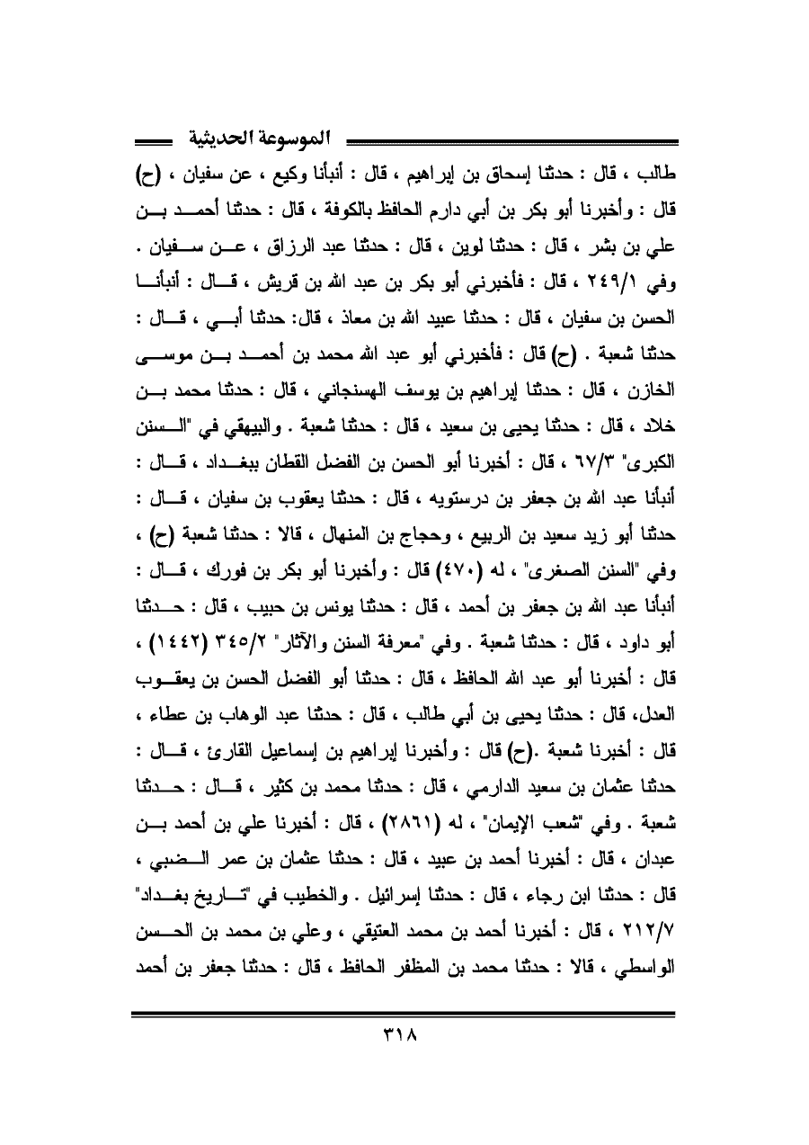 طالب، قال: حدثنا إسحاق بن إبراهيم، قال: أنبأنا وكيع، عن سفيان، (ح) قال: وأخبرنا أبو بكر بن أبي دارم الحافظ بالكوفة، قال: حدثنا أحمد بن علي بن بشر، قال: حدثنا لوين، قال: حدثنا عبد الرزاق، عن سفيان. وفي ١/ ٢٤٩، قال: فأخبرني أبو بكر بن عبد الله بن قريش، قال: أنبأنا الحسن بن سفيان، قال: حدثنا عبيد الله بن معاذ، قال: حدثنا أبي، قال: حدثنا شعبة. (ح) قال: فأخبرني أبو عبد الله محمد بن أحمد بن موسى الخازن، قال: حدثنا إبراهيم بن يوسف الهسنجاني، قال: حدثنا محمد بن خلاد، قد: حدثنا يحيى بن سعيد، قال: حدثنا شعبة. والبيهقي في "السنن الكبرى" ٣/ ٦٧، قال: أخبرنا أبو الحسن بن الفضل القطان ببغداد، قال: أنبأنا عبد الله بن جعفر بن درستويه، قال: حدثنا يعقوب بن سفيان، قال: حدثنا أبو زيد سعيد بن الربيع، وحجاج بن المنهال، قالا: حدثنا شعبة (ح)، وفي "السنن الصغرى"، له (٤٧٠) قال: وأخبرنا أبو بكر بن فورك، قال: أنبأنا عبد الله بن جعفر بن أحمد، قال: حدثنا يونس بن حبيب، قد: حدثنا أبو داود، قال: حدثنا شعبة. وفي "معرفة السنن والآثار" ٢/ ٣٤٥ (١٤٤٢)، قال: أخبرنا أبو عبد الله الحافظ، قال: حدثنا أبو الفضل الحسن بن يعقوب العدل، قال: حدثنا يحيى بن أبي طالب، قال: حدثنا عبد الوهاب بن عطاء، قال: أخبرنا شعبة. (ح) قال: وأخبرنا إبراهيم بن إسماعيل القارئ، قال: حدثنا عثمان بن سعيد الدارمي، قال: حدثنا محمد بن كثير، قال: حدثنا شعبة. وفي "شعب الإيمان"، له (٢٨٦١)، قال: أخبرنا علي بن أحمد بن عبدان، قال: أخبرنا أحمد بن عبيد، قال: حدثنا عثمان بن عمر الضبي، قال: حدثنا ابن رجاء، قال: حدثنا إسرائيل. والخطيب في "تاريخ بغداد" ٧/ ٢١٢، قال: أخبرنا أحمد بن محمد العتيقي، وعلى بن محمد بن الحسن الواسطى، قالا: حدثنا محمد بن المظفر الحافظ، قال: حدثنا جعفر بن أحمد