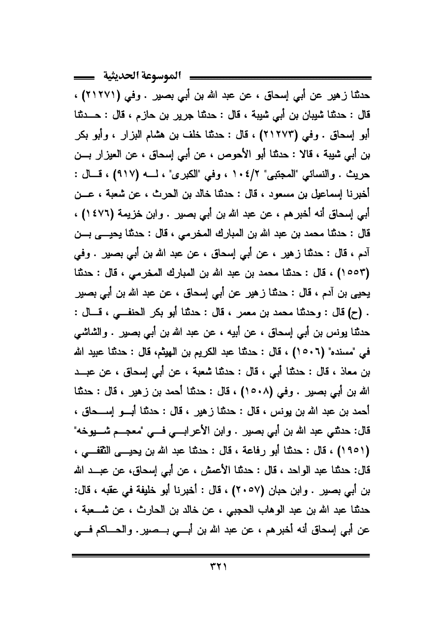 حدثنا زهير عن أبي إسحاق، عن عبد الله بن أبي بصير. وفي (٢١٢٧١)، قال: حدثنا شيبان بن أبي شيبة، قال: حدثنا جرير بن حازم، قال: حدثنا أبو إسحاق. وفي (٢١٢٧٣)، قال: حدثنا دخلت بن هشام البزار، وأبو بكر بن أبي شيبة، قالا: حدثنا أبو الأحوص، عن أبي إسحاق، عن العيزار بن حريث. والنسائي "المجتبى" ٢/ ١٠٤، وفي "الكبرى"، له (٩١٧)، قال: أخبرنا إسماعيل بن مسعود، قال: حدثنا خالد بن الحرث، عن شعبة، عن أبي إسحاق أنه أخبرهم، عن عبد الله بن أبي بصير. وابن خزيمة (١٤٧٦)، قال: حدثنا محمد بن عبد الله بن المبارك المخرمي، قال: حدثنا يحيى بن آدم، قال: حدثنا زهير، عن أبي إسحاق، عن عبد الله بن أبي بصير. وفي (١٥٥٣)، قال: حدثنا محمد بن عبد الله بن المبارك المخرمي، قال: حدثنا يحيى بن آدم، قال: حدثنا زهير عن أبي إسحاق، عن عبد الله بن أبي بصير. (ح) قال: وحدثنا محمد بن معمر، قال: حدثنا أبو بكر الحنفي، قال: حدثنا يونس بن أبي إسحاق، عن أبيه، عن عبد الله بن أبي بصير. والشاشي في "مسنده" (١٥٠٦)، قال: حدثنا عبد الكريم بن الهيثم، قال: حدثنا عبيد الله بن معاذ، قال: حدثنا أبي، قال: حدثنا شعبة، عن أبي إسحاق، عن عبد الله بن أبي بصير. وفي (١٥٠٨)، قال: حدثنا أحمد بن زهير، قال: حدثنا أحمد بن عبد الله بن يونس، قال: حدثنا زهير، قال: حدثنا أبو إسحاق، قال: حدثني عبد الله بن أبي بصير. وابن الأعرابي في "معجم شيوخه" (١٩٥١)، قال: حدثنا أبو رفاعة، قال: حدثنا عبد الله بن يحيى الثقفي، قال: حدثنا عبد الواحد، قال: حدثنا الأعمش، عن أبي إسحاق، عن عبد الله بن أبي بصير. وابن حبان (٢٠٥٧)، قال: أخبرنا أبو خليفة في عقبه، قال: حدثنا عبد الله بن عبد الوهاب الحجبي، عن خالد بن الحارث، عن شعبة، عن أبي إسحاق أنه أخبرهم، عن عبد الله بن أبي بصير. والحاكم في
