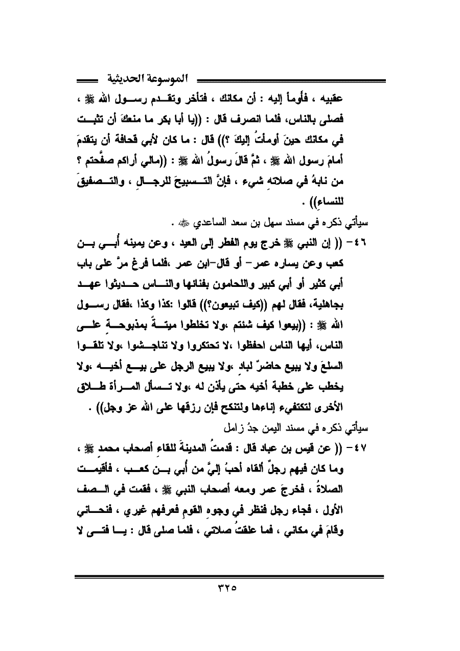 عقبيه، فأَومأ بيه: أن مكانك، فتأخر وتقدم رسول اللّه - صلى الله عليه وسلم -، فصلى بالناس، فلما انصرف قال: "يا أبا بكر ما منعكَ أن تثبت في مكانك حينَ أومأتُ إليكَ؟ " قال: ما كان لأبى قحافة أن يتقدمَ أمامَ رسول اللّه - صلى الله عليه وسلم -، ثمَّ قالَ رسولُ اللّه - صلى الله عليه وسلم -: "ما لي أَراكم صفَّحتم؟ من نابهُ في صلاتهِ شيء، فإنَّ التسبيحَ للرجالِ، والتصفيقَ للنساءِ".