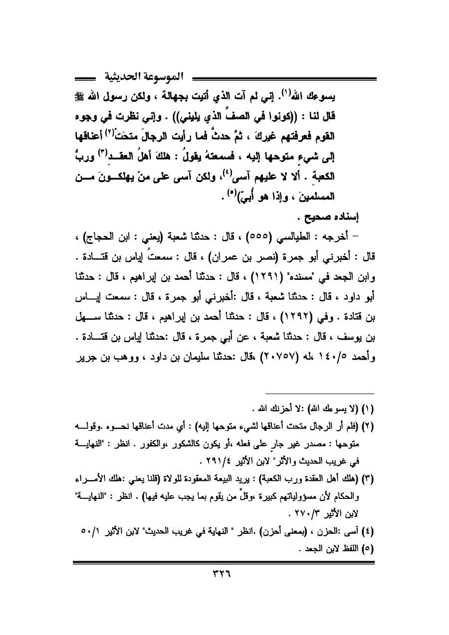 يسوءك اللّه (¬١). إنى لم آت الذي أتيت بجهلة، ولكن رسول اللّه - صلى الله عليه وسلم - قال لنا: "كونوا في الصفِّ الذي يلينى". وإنى نظرت في وجوه القوم فعرفتهم غيركَ، ثمَّ حدثَّ فما رأيت الرجالَ متحَتْ (¬٢) أعناقها إلى شئٍ متوجحها إليه، فسمعتهُ يقولُ: هلكَ أهلُ العقدِ (¬٣) وربُّ الكعبةِ. أَلا لا عيهم آسى (¬٤)، ولكن آسى على من يهلكونَ من المسلمينَ، وإذا هو أَبيّ) (¬٥).