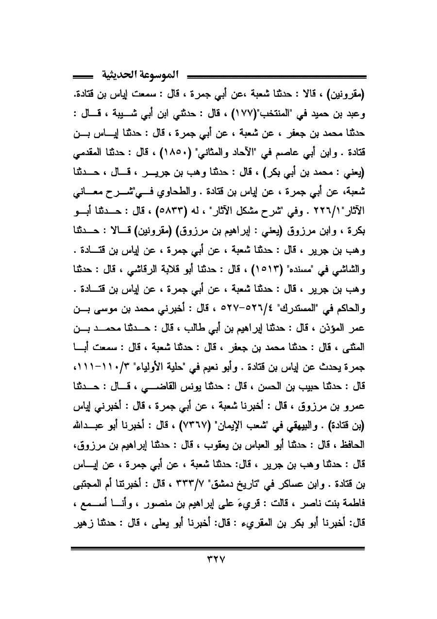 (مقرونين)، قالا: حدثنا شعبة، عن أبي جمرة، قال: سمعت الناس بن قتادة. وعبد بن حميد في "المنتخب" (١٧٧)، قال: حدثني ابن أبي شيبة، قال: حدثنا محمد بن جعفر، عن شعبة، عن أبي جمرة، قال: حدثنا إباس بن قتادة. وابن أبي عاصم في "الآحاد والمثاني" (١٨٥٠)، قال: حدثنا المقدمي (يعني: محمد بن أبي بكر)، قال: حدثنا وهب بن جرير، قال، حدثنا شعبة، عن أبي جمرة، عن الناس بن قتادة. والطحاوي في "شرح معاني الآثار" ١/ ٢٢٦. وفي "شرح مشكل الآثار"، له (٥٨٣٣)، قال: حدثنا أبو بكرة، وابن مرزوق (يعني: إبراهيم بن مرزوق) (مقرونين) قالا: حدثنا وهب بن جرير، قال: حدثنا شعبة، عن أبي جمرة، عن الناس بن قتادة. والشاشي في "مسنده" (١٥١٣)، قال: حدثنا أبو قلابة الرقاشي، قال: حدثنا وهب بن جرير، قال: حدثنا شعبة، عن أبي جمرة، عن إياس بن قتادة. والحاكم في "المستدرك" ٤/ ٥٢٦ - ٥٢٧، قال: أخبرني محمد بن موسى بن عمر المؤذن، قال: حدثنا إبراهيم بن أبي طالب، قال: حدثنا محمد بن المثنى، قال: حدثنا محمد بن جعفر، قال: حدثنا شعبة، قال: سمعت أبا جمرة يحدث عن إياس بن قتادة. وأبو نعيم في "حلية الأولياء" ٣/ ١١٠ - ١١١، قال: حدثنا حبيب بن الحسن، قال: حدثنا يونس القاضي، قال: حدثنا عمرو بن مرزوق، قال: أخبرنا شعبة، عن أبي جمرة، قال: أخبرني إياس (بن قتادة). والبيهقي في "شعب الإيمان" (٧٣٦٧)، قال: أخبرنا أبو عبد الله الحافظ، قال: حدثنا أبو العباس بن يعقوب، قال: حدثنا إبراهيم بن مرزوق، قال: حدثنا وهب بن جرير، قال: حدثنا شعبة، عن أبي جمرة، عن الناس بن قتادة. وابن عساكر في "تاريخ دمشق" ٧/ ٣٣٣، قال: أخبرتنا أم المجتبى فاطمة بنت ناصر، قالت: قريءَ على إبراهيم بن منصور، وأنا أسمع، قال: أخبرنا أبو بكر بن المقريء: قال: أخبرنا أبو يعلى، قال: حدثنا زهير