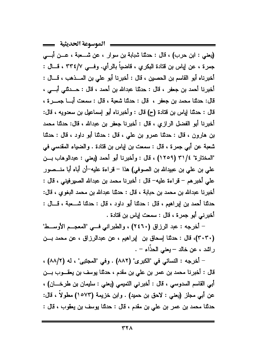 (يعني: ابن حرب)، قال: حدثنا شبابة بن سوار، عن شعبة، عن أبي جمرة، عن الناس بن قتادة البكري، قاضيًا بالرأي. وفي ٧/ ٣٣٤، قال: أخبرناه أبو القاسم بن الحصين، قال: أخبرنا أبو علي بن المذهب، قال: أخبرنا أحمد بن جعفر، قال: حدثنا عبد الله بن أحمد، قال: حدثني أبي، قال: حدثنا محمد بن جعفر، قال: حدثنا شعبة، قال: سمعت أبا جمرة، قال: حدثنا الناس بن قتادة (ح) قال: وأخبرناه أبو إسماعيل بن سعدويه، قال: أخبرنا أبو الفضل الرازي، قال: أخبرنا جعفر بن عبد الله، قال: حدثنا محمد بن هارون، قال: حدثنا عمرو بن علي، قال: حدثنا أبو داود، قال: حدثنا شعبة عن أبي جمرة، قال: سمعت بن الناس بن قتادة. والضياء المقدسي في "المختارة" ٤/ ٣١ (١٢٥٩)، قال: وأخبرنا أبو أحمد (يعني: عبد الوهاب بن علي بن علي بن عبيد الله بن الصوفي) هذا - قراءة عليه - أن أباه أبا منصور علي أخبرهم - قراءة عليه - قال: أخبرنا محمد بن عبد الله الصيرفينى، قال: أخبرنا عبد الله بن محمد بن حبابة، قال: حدثنا عبد الله بن محمد البغوي، قال: حدثنا أحمد بن إبراهيم، قال: حدثنا أبو داود، قال: حدثنا شعبة، قال: أخبرني أبو جمرة، قال: سمعت إياس بن قتادة.