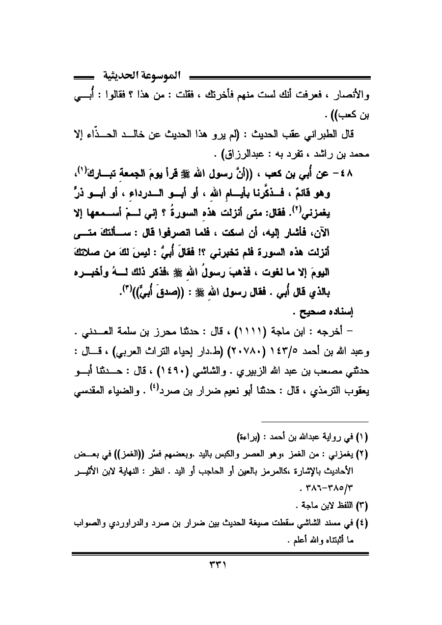 ٤٨ - عن أُبى بن كعب، "أنَّ رسول اللّه - صلى الله عليه وسلم - قرأ يومَ الجمعة تباركَ (¬١)، وهو قائمٌ، فذكَّرنا بأيامِ اللهِ، أو أبو الدرداءِ، أو أبو ذرٍّ يغمزني (¬٢). فقال: متى أنزلت هذهِ السورةُ؟ إنى لمْ أسمعها إِلَّا الآن، فأشار بيه، أن اسكت، فلما انصرفوا قال: سألتكَ متى أنزلت هذه السورة فلم تخبرنى؟! فقالَ أبى: ليسَ لكَ من صلَاتكَ اليومَ إِلَّا ما لغوت، فذهبَ رسولُ اللّهِ - صلى الله عليه وسلم -، فذكر ذلك لهُ وأخبره بالذي قال أبى. فقال رسول اللّهِ - صلى الله عليه وسلم -: "صدقَ أبيٌّ" (¬٣).