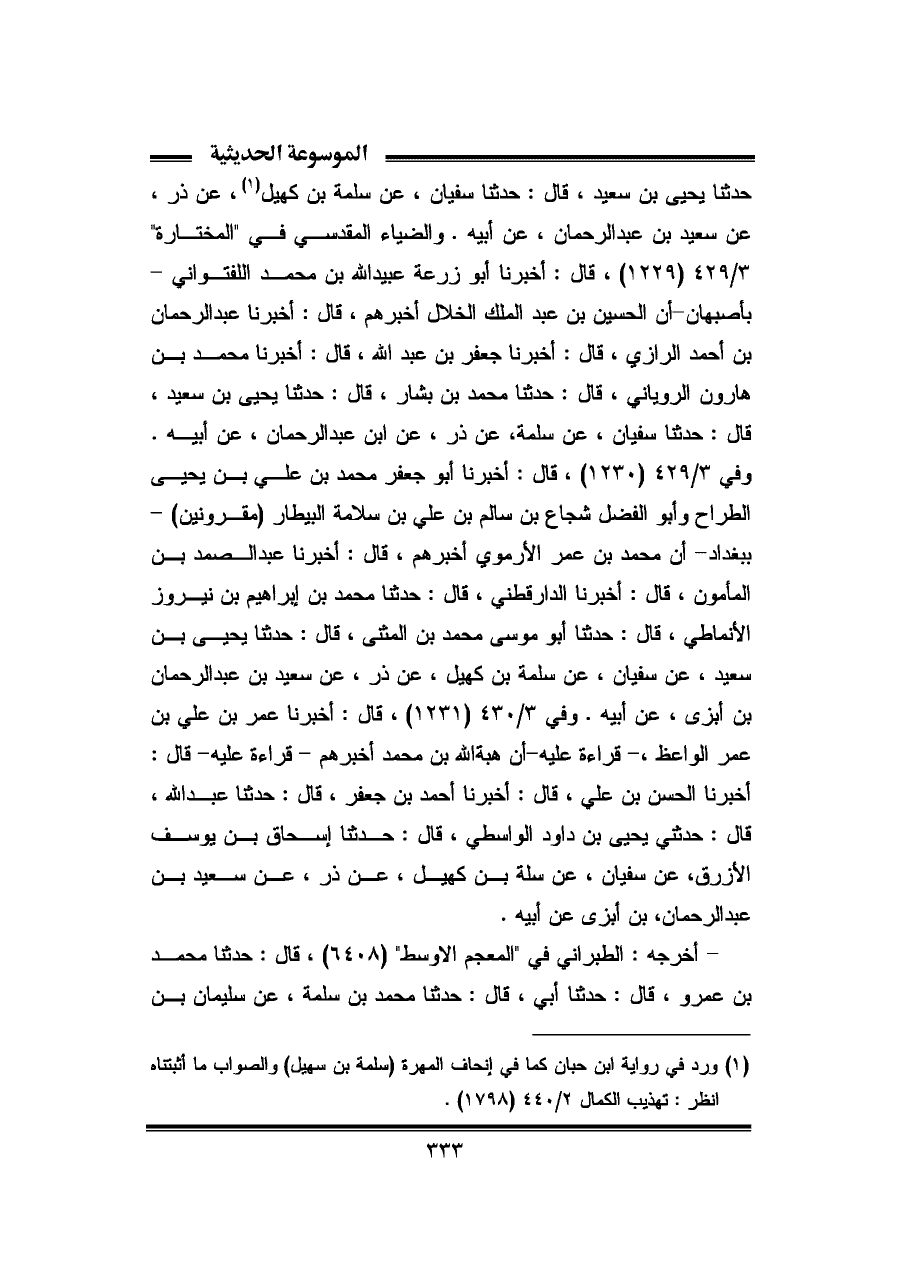 حدثنا يحيى بن سعيد، قال: حدثنا سفيان، عن سلمة بن كهيل (¬١)، عن ذر، عن سعيد بن عبد الرحمان، عن أبيه. والضياء المقدسي في "المختارة" ٣/ ٤٢٩ (١٢٢٩)، قال: أخبرنا أبو زرعة عبيد الله بن محمد اللفتواني - بأصبهان - أن الحسين بن عبد الملك الخلال أخبرهم، قال: أخبرنا عبد الرحمان بن أحمد الرازي، قال: أخبرنا جعفر بن عبد الله، قال: أخبرنا محمد بن هارون الروياني، قال: حدثنا محمد بن بشار، قال: حدثنا يحيى بن سعيد، قال: حدثنا سفيان، عن سلمة، عن ذر، عن ابن عبد الرحمان، عن أبيه. وفي ٣/ ٤٢٩ (١٢٣٠)، قال: أخبرنا أبو جعفر محمد بن علي بن يحيى الطراح وأبو الفضل شجاع بن سالم بن علي بن سلامة البيطار (مقرونين) - ببغداد - أن محمد بن عمر الأرموى أخبرهم، قال: أخبرنا عبد الصمد بن المأمون، قال: أخبرنا الدارقطني، قال: حدثنا محمد بن إبراهيم بن نيروز الأنماطي، قال: حدثنا أبو موسى محمد بن المثنى، قال: حدثنا يحيى بن سعيد، عن سفيان، عن سلمة بن كهيل، عن ذر، عن سعيد بن عبد الرحمان بن أبزى، عن أبيه. وفي ٣/ ٤٣٠ (١٢٣١)، قال: أخبرنا عمر بن علي بن عمر الواعظ، - قراءة عليه - أن هبة الله بن محمد أخبرهم - قراءة عليه - قال: أخبرنا الحسن بن علي، قال: أخبرنا أحمد بن جعفر، قال: حدثنا عبد الله، قال: حدثني يحيى بن داود الواسطي، قال: حدثنا إسحاق بن يوسف الأزرق، عن سفيان، عن سلمة بن كهيل، عن ذر، عن سعيد بن عبد الرحمان، بن أبزى عن أبيه.