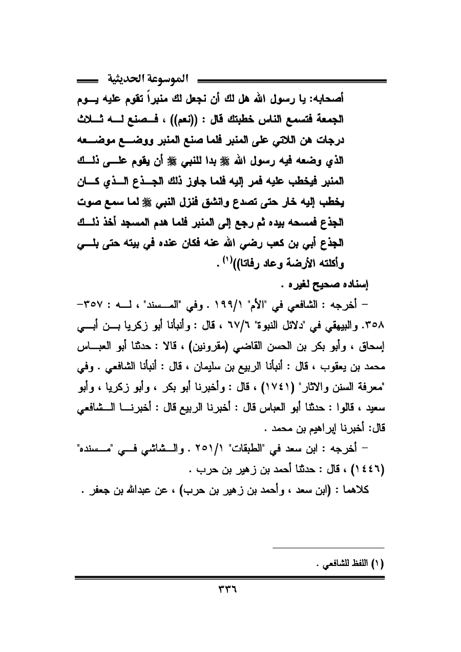 أصحابه: يا رسول اللّه هل لك أن نجعل لك منبرًا تقوم عليه يوم الجمعة فتسمع الناس خطبتك قال: "نعم"، فصنع له ثلاث درجات هن اللاتي على المنبر فلما صنع المنبر ووضع موضعه الذي وضعه فيه رسول اللّه - صلى الله عليه وسلم - بدا للنبي - صلى الله عليه وسلم - أن يقوم على ذلك المنبر فيخطب عيه فمر إليه فلما جاوز ذلك الجذع الذي كان يخطب إليه خار حتى تصدع وانشق فنزل النَّبِيّ - صلى الله عليه وسلم - لما سمع صوت الجذع فمسحه بيده ثم رجع إلى المنبر فلما هدم المسجد أَخذ ذلك الجذع أبي بن كعب رضى الله عنه فكان عنده في بيته حتى بلي وأكلته الأرضة وعاد رفاتا" (¬١).