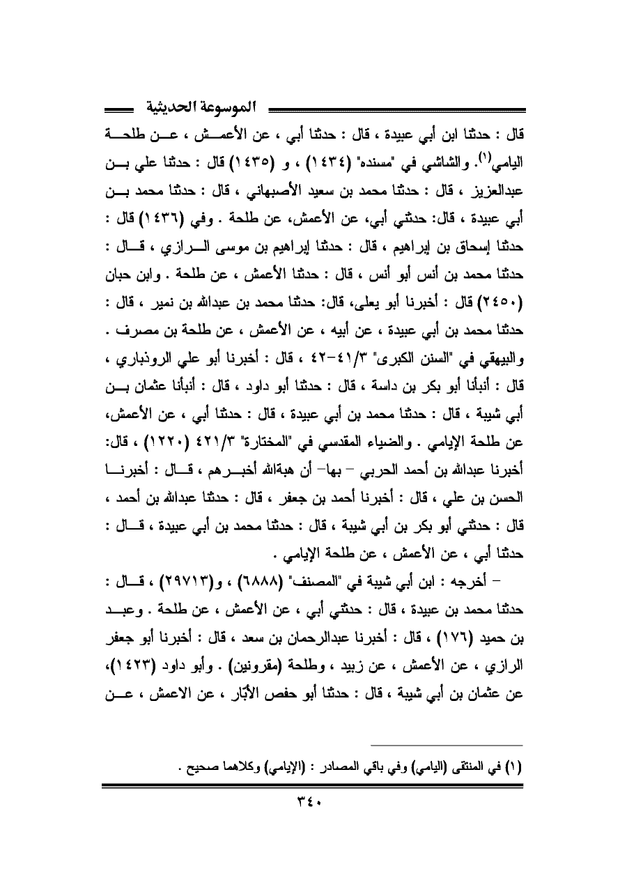 قال: حدثنا ابن أبي عبيدة، قال: حدثنا أبي، عن الأعمش، عن طلحة اليامي (¬١). والشاشي في "مسنده" (١٤٣٤)، و (١٤٣٥) قال: حدثنا علي بن عبد العزيز، قال: حدثنا محمد بن سعيد الأصبهاني، قال: حدثنا محمد بن أبي عبيدة، قال: حدثني أبي، عن الأعمش، عن طلحة. وفي (١٤٣٦) قال: حدثنا إسحاق بن إبراهيم، قال: حدثنا إبراهيم بن موسى الرازي، قال: حدثنا محمد بن أنس أبو أنس، قال: حدثنا الأعمش، عن طلحة. وابن حبان (٢٤٥٠) قال: أخبرنا أبو يعلى، قال: حدثنا محمد بن عبد الله بن نمير، قال: حدثنا محمد بن أبي عبيدة، عن أبيه، عن الأعمش، عن طلحة بن مصرف. والبيهقي في "السنن الكبرى" ٣/ ٤١ - ٤٢، قال: أخبرنا أبو علي الروذباري، قال: أنبأنا أبو بكر بن داسة، قال: حدثنا أبو داود، قال: أنبأنا عثمان بن أبي شيبة، قال: حدثنا محمد بن أبي عبيدة، قال: حدثنا أبي، عن الأعمش، عن طلحة الإيامي. والضياء المقدسي في "المختارة" ٣/ ٤٢١ (١٢٢٠)، قال: أخبرنا عبد الله بن أحمد الحربي - بها - أن هبة الله أخبرهم، قال: أخبرنا الحسن بن علي، قال: أخبرنا أحمد بن جعفر، قال: حدثنا عبد الله بن أحمد، قال: حدثني أبو بكر بن أبي شيبة، قال: حدثنا محمد بن أبي عبيدة، قال: حدثنا أبي، عن الأعمش، عن طلحة الإيامي.