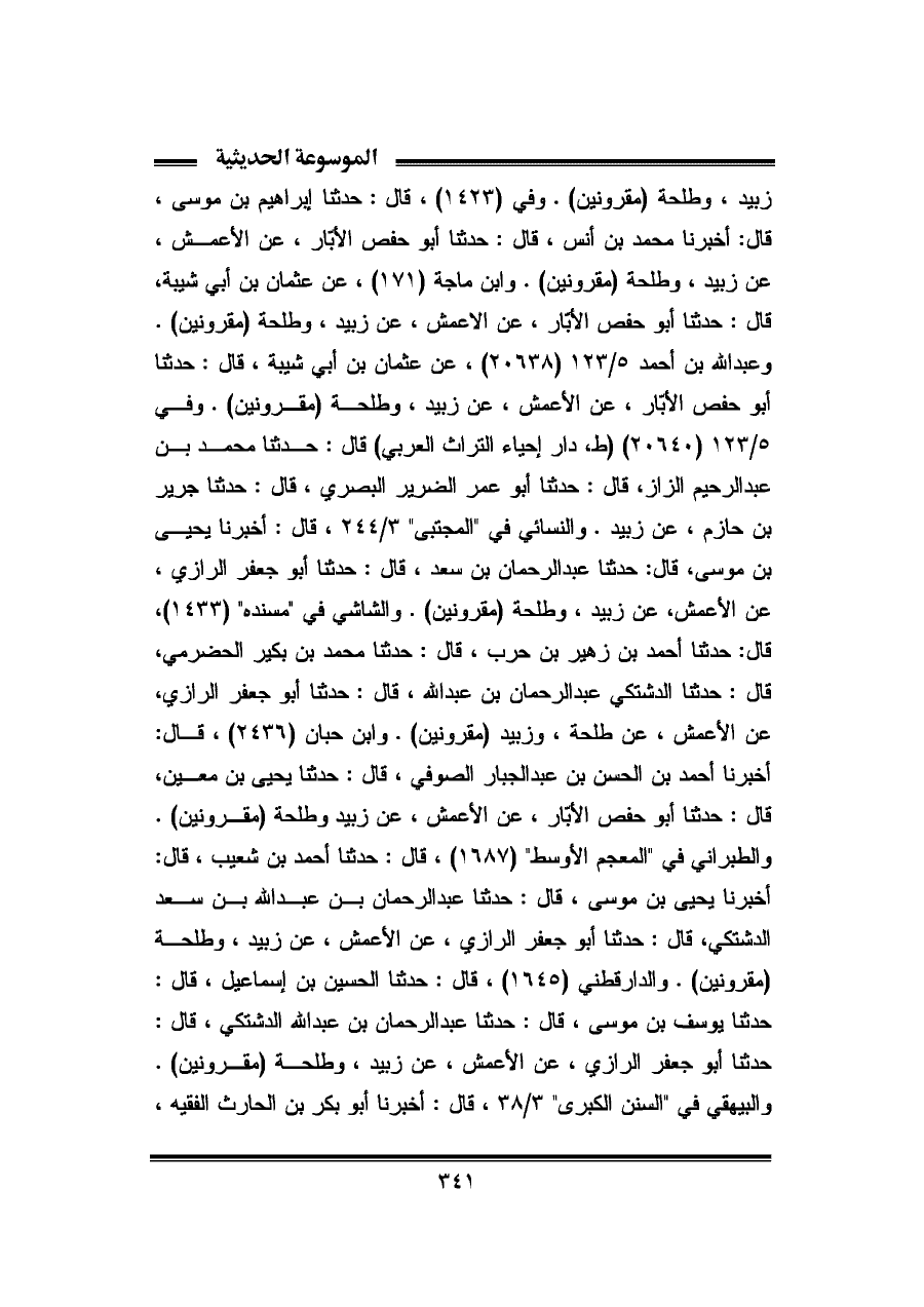زبيد، وطلحة (مقرونين). وفي (١٤٢٣)، قال: حدثنا إبراهيم بن موسى، قال: أخبرنا محمد بن أنس، قال: حدثنا أبو حفص الأبّار، عن الأعمش، عن زبيد، وطلحة (مقرونين). وابن ماجة (١٧١)، عن عثمان بن أبي شيبة، قال: حدثنا أبو حفص الأبّار، عن الأعمش، عن زبيد، وطلحة (مقرونين). وعبد الله بن أحمد ٥/ ١٢٣ (٢٠٦٣٨)، عن عثمان بن أبي شيبة، قال: حدثنا أبو حفص الأبّار، عن الأعمش، عن زبيد، وطلحة (مقرونين). وفي ٥/ ١٢٣ (٢٠٦٤٠) (ط، دار إحياء التراث العربي) قال: حدثنا محمد بن عبد الرحيم الزاز، قال: حدثنا أبو عمر الضرير البصري، قال: حدثنا جرير بن حازم، عن زبيد. والنسائي في "المجتبى" ٣/ ٢٤٤، قال: أخبرنا يحيى بن موسى، قال: حدثنا عبد الرحمان بن سعد، قال: حدثنا أبو جعفر الرازي، عن الأعمش، عن زبيد، وطلحة (مقرونين). والشاشي في "مسنده" (١٤٣٣)، قال: حدثنا أحمد بن زهير بن حرب، قال: حدثنا محمد بن بكير الحضرمي، قال: حدثنا الدشتكي عبد الرحمان بن عبد الله، قال: حدثنا أبو جعفر الرازي، عن الأعمش، عن طلحة، وزبيد (مقرونين). وابن حبان (٢٤٣٦)، قال: أخبرنا أحمد بن الحسن بن عبد الجبار الصوفي، قال: حدثنا يحيى بن معين، قال: حدثنا أبو حفص الأبار، عن الأعمش، عن زبيد وطلحة (مقرونين). والطبراني في "المعجم الأوسط" (١٦٨٧)، قال: حدثنا أحمد بن شعيب، قال: أخبرنا يحيى بن موسى، قال: حدثنا عبد الرحمان بن عبد الله بن سعد الدشتكي، قال: حدثنا أبو جعفر الرازي، عن الأعمش، عن زبيد، وطلحة (مقرونين). والدارقطني (١٦٤٥)، قال: حدثنا الحسين بن إسماعيل، قال: حدثنا يوسف بن موسى، قال: حدثنا عبد الرحمان بن عبد الله الدشتكي، قال: حدثنا أبو جعفر الرازي، عن الأعمش، عن زبيد، وطلحة (مقرونين).