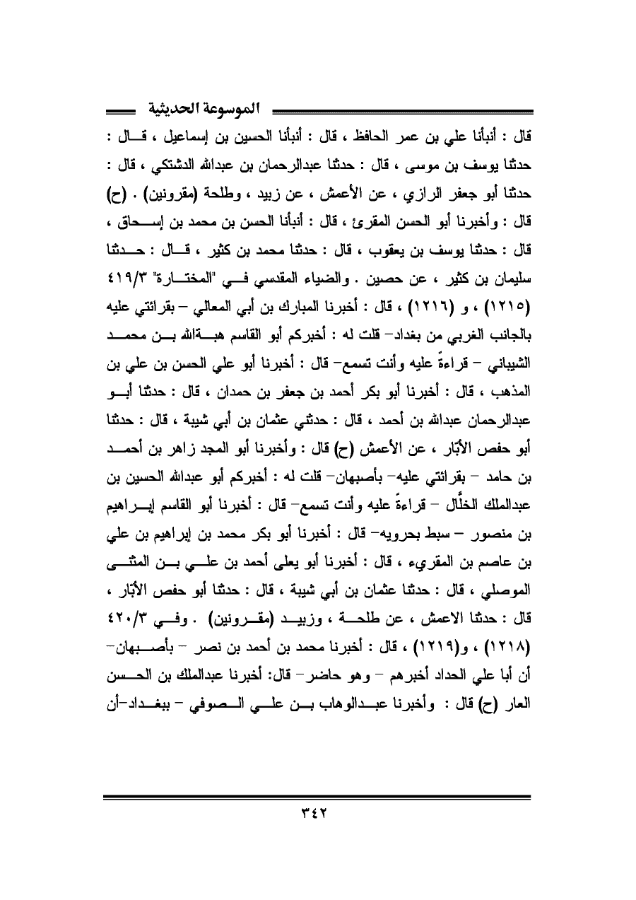 قال: أنبأنا علي بن عمر الحافظ، قال: أنبأنا الحسين بن إسماعيل، قال: حدثنا يوسف بن موسى، قال: حدثنا عبد الرحمان بن عبد الله الدشتكى، قال: حدثنا أبو جعفر الرازي، عن الأعمش، عن زبيد، وطلحة (مقرونين). (ح) قال: وأخبرنا أبو الحسن المقرئ، قال: أنبأنا الحسن بن محمد بن إسحاق، قال: حدثنا يوسف بن يعقوب، قال: حدثنا محمد بن كثير، قال: حدثنا سليمان بن كثير، عن حصين. والضياء المقدسي في "المختارة" ٣/ ٤١٩ (١٢١٥)، و (١٢١٦)، قال: أخبرنا المبارك بن أبي المعالي - بقرائتي عليه بالجانب الغربي من بغداد - قلت له: أخبركم أبو القاسم هبة الله بن محمد الشيباني - قراءةً عليه وأنت تسمع - قال: أخبرنا أبو علي الحسن بن علي بن المذهب، قال: أخبرنا أبو بكر أحمد بن جعفر بن حمدان، قال: حدثنا أبو عبد الرحمان عبد الله بن أحمد، قال: حدثني عثمان بن أبي شيبة، قال: حدثنا أبو حفص الأبّار، عن الأعمش (ح) قال: وأخبرنا أبو المجد زاهر بن أحمد بن حامد - بقرائتي عليه - بأصبهان - قلت له: أخبركم أبو عبد الله الحسين بن عبد الملك الخلَّال - قراءةً عليه وأنت تسمع - قال: أخبرنا أبو القاسم إبراهيم بن منصور - سبط بحرويه - قال: أخبرنا أبو بكر محمد بن إبراهيم بن علي بن عاصم بن المقرئ، قال: أخبرنا أبو يعلى أحمد بن علي بن المثنى الموصلي، قال: حدثنا عثمان بن أبي شيبة، قال: حدثنا أبو حفص الأبّار، قال: حدثنا الأعمش، عن طلحة، وزبيد (مقرونين). وفي ٣/ ٤٢٠ (١٢١٨)، و (١٢١٩)، قال: أخبرنا محمد بن أحمد بن نصر - بأصبهان - أن أبا علي الحداد أخبرهم - وهو حاضر - قال: أخبرنا عبد الملك بن الحسن العار (ح) قال: وأخبرنا عبد الوهاب بن علي الصوفي - ببغداد - أن