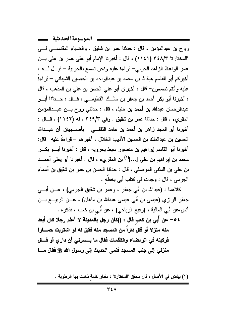 روح بن عبد المؤمن، قال: حدثنا عمر بن شقيق. والضياء المقدسي في "المختارة" ٣/ ٣٤٨ (١١٤١)، قال: أخبرنا الإمام أبو على عمر بن علي بن عمر الواعظ الزاهد الحربي - قراءة عليه ونحن نسمع بالحربية - قيل له: أخبركم أبو القاسم هبة الله بن محمد بن عبد الواحد بن الحصين الشيباني - قراءةً عليه وأنتم تسمعون - قال: أخبرنا أبو علي الحسن بن علي بن المذهب، قال: أخبرنا أبو بكر أحمد بن جعفر بن مالك القطيعي، قال: حدثنا أبو عبد الرحمان عبد الله بن أحمد بن حنبل، قال: حدثني روح بن عبد المؤمن المقريء، قال: حدثنا عمر بن شقيق. وفي ٣/ ٣٤٩، له (١١٤٢)، قال: أخبرنا أبو المجد زاهر بن أحمد بن حامد الثقفي - بأصبهان - أن عبد الله الحسين بن عبد الملك بن الحسين الأديب الخلال، أخبرهم - قراءةً عليه - قال: أخبرنا أبو القاسم إبراهيم بن منصور سبط بحرويه، قال: أخبرنا أبو بكر محمد بن إبراهيم بن علي [ ... ] (¬١) بن المقريء، قال: أخبرنا أبو يعلى أحمد بن على بن المثنى الموصلي، قال: حدثنا الحسن بن عمر بن شقيق بن أسماء الجرمي، قال: وجدت في كتاب أبي بخطِّهِ.