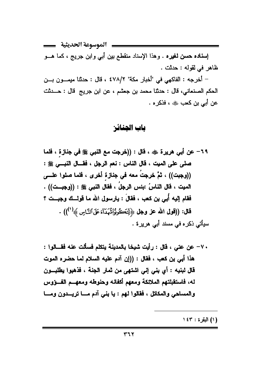 ٦٩ - عن أبي هريرة - رضي الله عنه -، قال: "خرجت مع النبي - صلى الله عليه وسلم - في جنازةٍ، فلما صلى على الميت، قال ألناس: نعم الرجل، فقال النبي - صلى الله عليه وسلم -: "وجبت"، ثمّ خرجتُ معه في جنازةٍ أخرى، فلما صلوا على الميت، قال الناسُ: بئس الرجلُ، فقال النبي - صلى الله عليه وسلم -: "وجبت". فقام إليه أُبى بن كعب، فقالَ: يا رسول الله ما قولك وجبت؟ قال: "قول الله عز وجل {لِتَكُونُوا شُهَدَاءَ عَلَى النَّاسِ} (¬١) ".