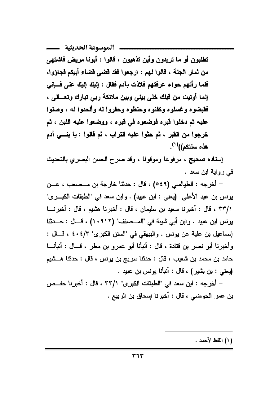 - أخرجه: الطيالسي (٥٤٩)، قال: حدثنا خارجة بن مصعب، عن يونس بن عبد الأعلى (يعني: ابن عبيد). وابن سعد في "الطبقات الكبرى" ١/ ٣٣، قال: أخبرنا سعيد بن سليمان، قال: أخبرنا هشيم، قال: أخبرنا يونس بن عبيد. وابن أبي شيبة في "المصنف" (١٠٩١٢)، قال: حدثنا إسماعيل بن علية عن يونس. والبيهقي في "السنن الكبرى" ٣/ ٤٠٤، قال: وأخبرنا أبو نصر بن قتادة، قال: أنبأنا أبو عمرو بن مطر، قال: أنبأنا حامد بن محمد بن شعيب، قال: حدثنا سريج بن يونس، قال: حدثنا هشيم (يعني: بن بشير)، قال: أنبأنا يونس بن عبيد.