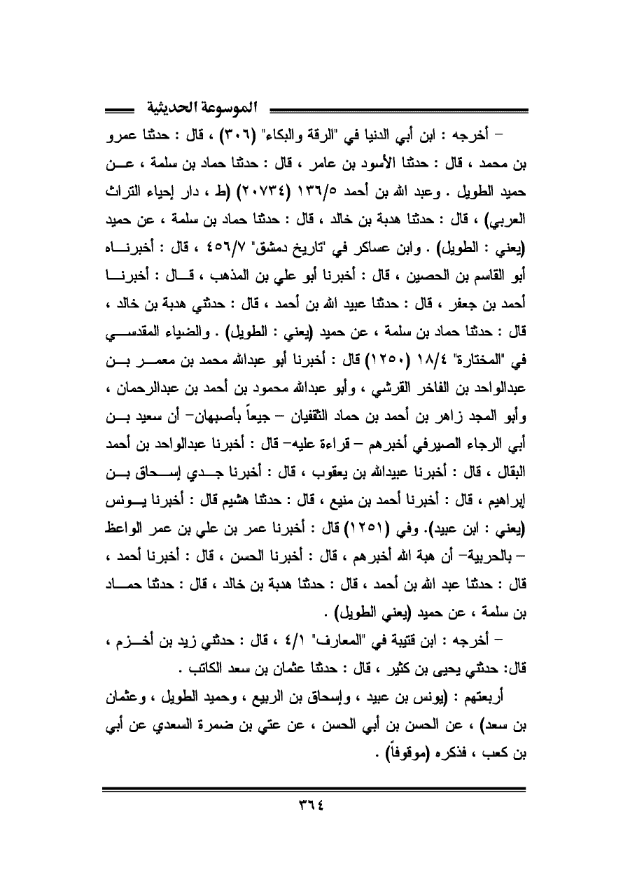 - أخرجه: ابن أبي الدنيا في "الرقة والبكاء" (٣٠٦)، قال: حدثنا عمرو بن محمد، قال: حدثنا الأسود بن عامر، قال: حدثنا حماد بن سلمة، عن حميد الطويل. وعبد الله بن أحمد ٥/ ١٣٦ (٢٠٧٣٤) (ط، دار إحياء التراث العربي)، قال: حدثنا هدبة بن خالد، قال: حدثنا حماد بن سلمة، عن حميد (يعني: الطويل). وابن عساكر في "تاريخ دمشق" ٧/ ٤٥٦، قال: أخبرناه أبو القاسم بن الحصين، قال: أخبرنا أبو علي بن المذهب، قال: أخبرنا أحمد بن جعفر، قال: حدثنا عبيد الله بن أحمد، قال: حدثني هدبة بن خالد، قال: حدثنا حماد بن سلمة، عن حميد (يعني: الطويل). والضياء المقدسي في "المختارة" ٤/ ١٨ (١٢٥٠) قال: أخبرنا أبو عبد الله محمد بن معمر بن عبد الواحد بن الفاخر القرشي، وأبو عبد الله محمود بن أحمد بن عبد الرحمان، وأبو المجد زاهر بن أحمد بن حماد الثقفيان - جميعًا بأصبهان - أن سعيد بن أبي الرجاء الصيرفي أخبرهم - قراءة عليه - قال: أخبرنا عبد الواحد بن أحمد البقال، قال: أخبرنا عبيد الله بن يعقوب، قال: أخبرنا جدي إسحاق بن إبراهيم، قال: أخبرنا أحمد بن منيع، قال: حدثنا هشيم قال: أخبرنا يونس (يعني: ابن عبيد). وفي (١٢٥١) قال: أخبرنا عمر بن علي بن عمر الواعظ - بالحربية - أن هبة الله أخبرهم، قال: أخبرنا الحسن، قال: أخبرنا أحمد، قال: حدثنا عبد الله بن أحمد، قال: حدثنا هدبة بن خالد، قال: حدثنا حماد بن سلمة، عن حميد (يعني الطويل).