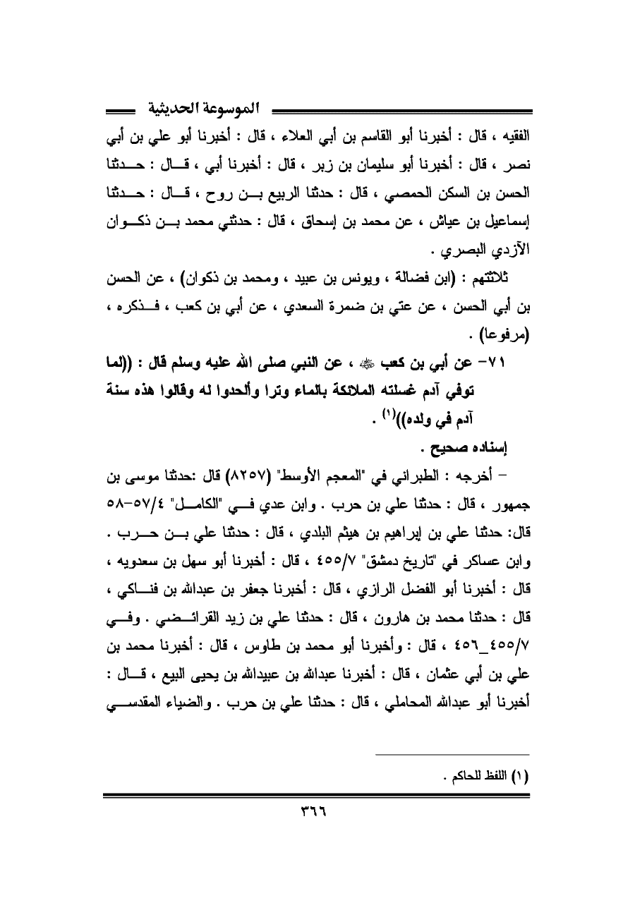 ٧١ - عن أبي بن كعب - رضي الله عنه -، عن النبي صلى عليه وسلم قال: "لما توفي آدم غسلته الملائكة بالماء وترا وألحدوا له وقالوا هذه سنة آدم في ولده" (¬١).