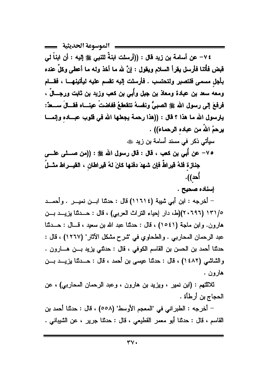 ٧٤ - عن أسامة بن زيد قال: "أرسلت ابنةٌ للنبى - صلى الله عليه وسلم - إليه: أن ابنًا لي قبض فأْتنا فأرسل يقرأ السلام ويقول: إنَّ لله ما أخذ وله ما أعطى وكلٌ عنده بأجلٍ مسمى فلتصبر ولتحتسب. فأرسلت إليه تقسم عليه ليأتينها، فقام ومعه سعد بن عبادة ومعاذ بن جبل وأُبى بن كعب وزيد بن ثابت ورجالٌ، فرفعَ بى رسول الله - صلى الله عليه وسلم - الصبيُّ ونفسهُ تتقعقعُ ففاضتْ عناه فقالَ سعدٌ: يا رسول الله ما هذا؟ قال: "هذا رحمة يجعلها الله في قلوب عبادهِ وإنما يرحمُ اللهُ من عبادهِ الرحماءَ".