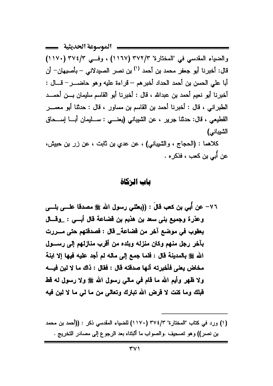 ٧٦ - عن أُبي بن كعب قالَ: "بعثني رسول الله - صلى الله عليه وسلم - مصدقا على بلى وعذرة وجميع بنى سعد بن هذيم بن قضاعة قال أبى: - وقال يعقوب في موضع آخر من قضاعة - قال: فصدقتهم حتى مررت بآخر رجل منهم وكان منزله وبلده من أقرب منازلهم إلى رسول الله - صلى الله عليه وسلم - مدينة قال: فلما جمع إلى ماله لم أجد عليه فيها إلا ابنة مخاض يعنى فأخبرته أنها صدقته قال: فقال: ذاك ما لا لبن فيه ولا ظهر وأيم الله ما قام في مالي رسول الله - صلى الله عليه وسلم - ولا رسول له قط قبلك وما كنت لا قرض الله تبارك وتعالى من ما لى ما لا لبن فيه