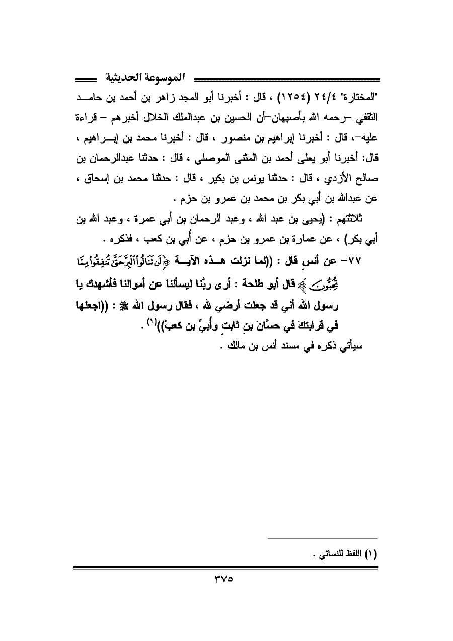 ٧٧ - عن أنس قال: "لما نزلت هذه الآية {لَنْ تَنَالُوا الْبِرَّ حَتَّى تُنْفِقُوا مِمَّا تُحِبُّونَ} قال أبو طلحة: أرى ربَّنا ليسألنا عن أموالنا فأشهدك يا رسول الله أني قد جعلت أرضي لله، فقال رسول الله: "اجعلها في قرابتكَ في حسَّانَ بنِ ثابتٍ وأُبيِّ بن كعبْ" (¬١).