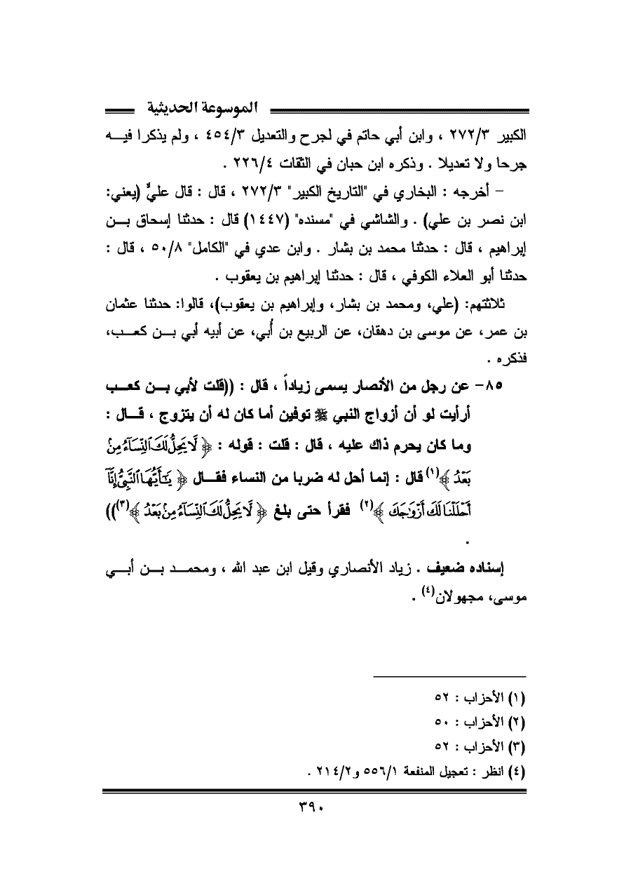 ٨٥ - عن رجل من الأنصار يسمى زيادًا، قال: "قلت لأبى بن كعب أرأيت لو أن أزواج النبي - صلى الله عليه وسلم - توفين أما كان له أن يتزوج، قال: وما كان يحرم ذاك عليه، قال: قلت: قوله: {لَا يَحِلُّ لَكَ النِّسَاءُ مِنْ بَعْدُ} (¬١) قال: إنما أحل له ضربا من النساء فقال {يَاأَيُّهَا النَّبِيُّ إِنَّا أَحْلَلْنَا لَكَ أَزْوَاجَكَ} (¬٢) فقرأ حتى بلغ {لَا يَحِلُّ لَكَ النِّسَاءُ مِنْ بَعْدُ} (¬٣) ".