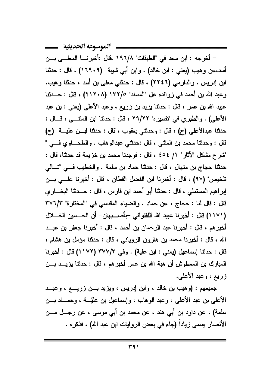 - أخرجه: ابن سعد في "الطبقات" ٨/ ١٩٦، قال: أخبرنا المعلى بن أسد، عن وهيب (يعني: ابن خالد). وابن أبي شيبة (١٦٩٠٩)، قال: حدثنا ابن إدريس. والدارمي (٢٢٤٦)، قال: حدثني معلى بن أسد، حدثنا وهيب. وعبد الله بن أحمد في زوائده على "المسند" ٥/ ١٣٢ (٢١٢٠٨)، قال: حدثنا عبيد الله بن عمر، قال: حدثنا يزيد بن زريع، وعبد الأعلى (يعني: بن عبد الأعلى). والطبرى في "تفسيره" ٢٢/ ٢٩، قال: حدثنا ابن المثنى، قال: حدثنا عبد الأعلى (ح)، قال: وحدثني يعقوب، قال: حدثنا ابن علية (ح) قال: وحدثنا محمد بن المثنى، قال: حدثني عبد الوهاب. والطحاوي في "شرح مشكل الآثار" ١/ ٤٥٤، قال: فوجدنا محمد بن خزيمة قد حدثنا، قال: حدثنا حجاج بن منهال، قال: حدثنا حماد بن سلمة. والخطيب في "تالي التلخيص" (٩٧)، قال: أخبرنا ابن الفضل القطان، قال: أخبرنا علي بن إبراهيم المستملي، قال: حدثنا أبو أحمد ابن فارس، قال: حدثنا البخاري قال: قال لنا: حجاج، عن حماد. والضياء المقدسي في "المختارة" ٣/ ٣٧٦ (١١٧١) قال: أخبرنا عبيد الله اللفتوائي بأصبهان - أن الحسين الخلال أخبرهم، قال: أخبرنا عبد الرحمان بن أحمد، قال: أخبرنا جعفر بن عبد الله، قال: أخبرنا محمد بن هارون الروياني، قال: حدثنا مؤمل بن هشام، قال: حدثنا إسماعيل (يعني: ابن علية). وفي ٣/ ٣٧٧ (١١٧٢) قال: أخبرنا المبارك بن المعطوش أن هبة الله بن عمر أخبرهم، قال: حدثنا يزيد بن زريع، وعبد الأعلى.
