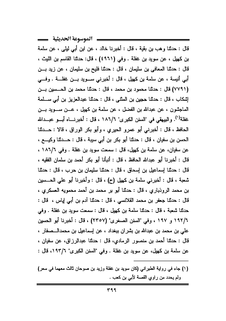 قال: حدثنا وهب بن بقية، قال: أخبرنا خالد، عن ابن أبي ليلى، عن سلمة بن كهيل، عن سويد بن غفلة. وفي (٤٩٦١)، قال: حدثنا القاسم بن الليث، قال: حدثنا المعافى بن سليمان، قال: حدثنا فليح بن سليمان، عن زيد بن أبي أنيسة، عن سلمة بن كهيل، قال: أخبرني سويد بن غفلة. وفي (٧٧٩١) قال: حدثنا محمود بن محمد، قال: حدثنا محمد بن الحسين بن إشكاب، قال: حدثنا حجين بن المثنى، قال: حدثنا عبد العزيز بن أبي سلمة الماجشون، عن عبد الله بن الفضل، عن سلمة بن كهيل، عن سويد بن غفلة (¬١). والبيهقي في "السنن الكبرى" ٦/ ١٨٦، قال: أخبرناه أبو عبد الله الحافظ، قال: أخبرني أبو عمرو الحيري، وأبو بكر الوراق، قالا: حدثنا الحسن بن سفيان، قال: حدثنا أبو بكر بن أبي شيبة، قال: حدثنا وكيع، عن سفيان، عن سلمة بن كهيل، قال: سمعت سويد بن غفلة. وفي ٦/ ١٨٦، قال: أخبرنا أبو عبد الله الحافظ، قال: أنبأنا أبو بكر أحمد بن سلمان الفقيه، قال: حدثنا إسماعيل بن إسحاق، قال: حدثنا سليمان بن حرب، قال: حدثنا شعبة، قال: أخبرني سلمة بن كهيل (ح)، قال: وأخبرنا أبو علي الحسين بن محمد الروذباري، قال: حدثنا أبو بر محمد بن أحمد محمويه العسكري، قال: حدثنا جعفر بن محمد القلانسي، قال: حدثنا آدم بن أبي إياس، قال: حدثنا شعبة، قال: حدثنا سلمة بن كهيل، قال: سمعت سويد بن غفلة. وفي ٦/ ١٩٢ و ١٩٧، وفي "السنن الصغرى" (٢٣٥٧)، قال: أخبرنا أبو الحسين علي بن محمد بن عبد الله بن بشران ببغداد، عن إسماعيل بن محمد الصفار، قال: حدثنا أحمد بن منصور الرمادي، قال: حدثنا عبد الرزاق، عن سفيان، عن سلمة بن كهيل، عن سويد بن غفلة. وفي "السنن الكبرى" ٦/ ١٩٣، قال: