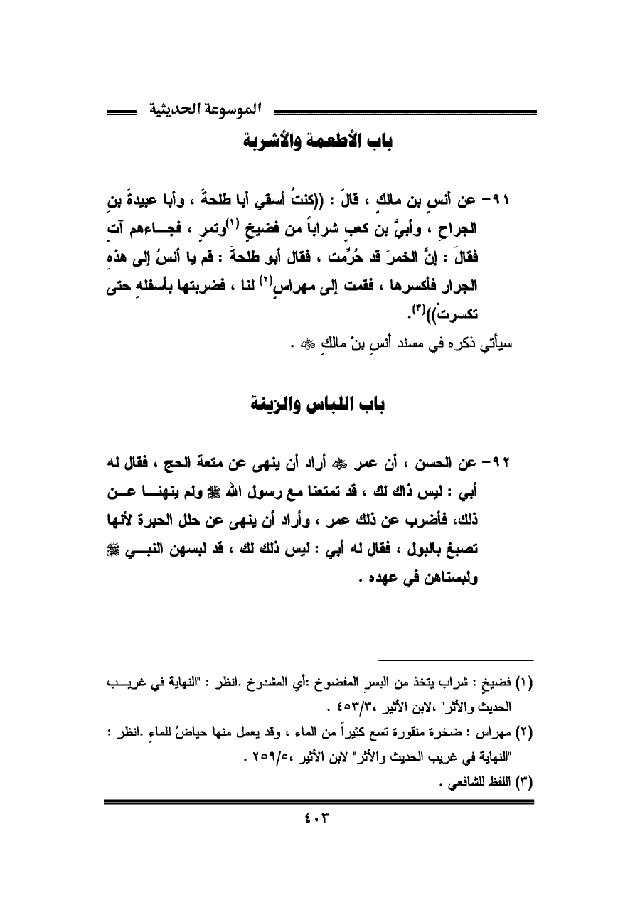 ٩١ - عن أنسٍ بن مالكٍ، قالَ: "كنتُ أسقى أبا طلحةَ، وأبا عبيدةَ بنِ الجراحِ، وأبيَّ بن كعبٍ شرابًا من فضيخٍ (¬١) وتمرٍ، فجاءهم آتٍ فقالَ: إنَّ الخمرَ قد حُرِّمت، فقال أبو طلحةَ: قم يا أنسُ إلى هذهِ الجرار فأكسرها، فقمت إلى مهراسٍ (¬٢) لنا، فضربتها بأسفلهِ حتى تكسرتْ" (¬٣).