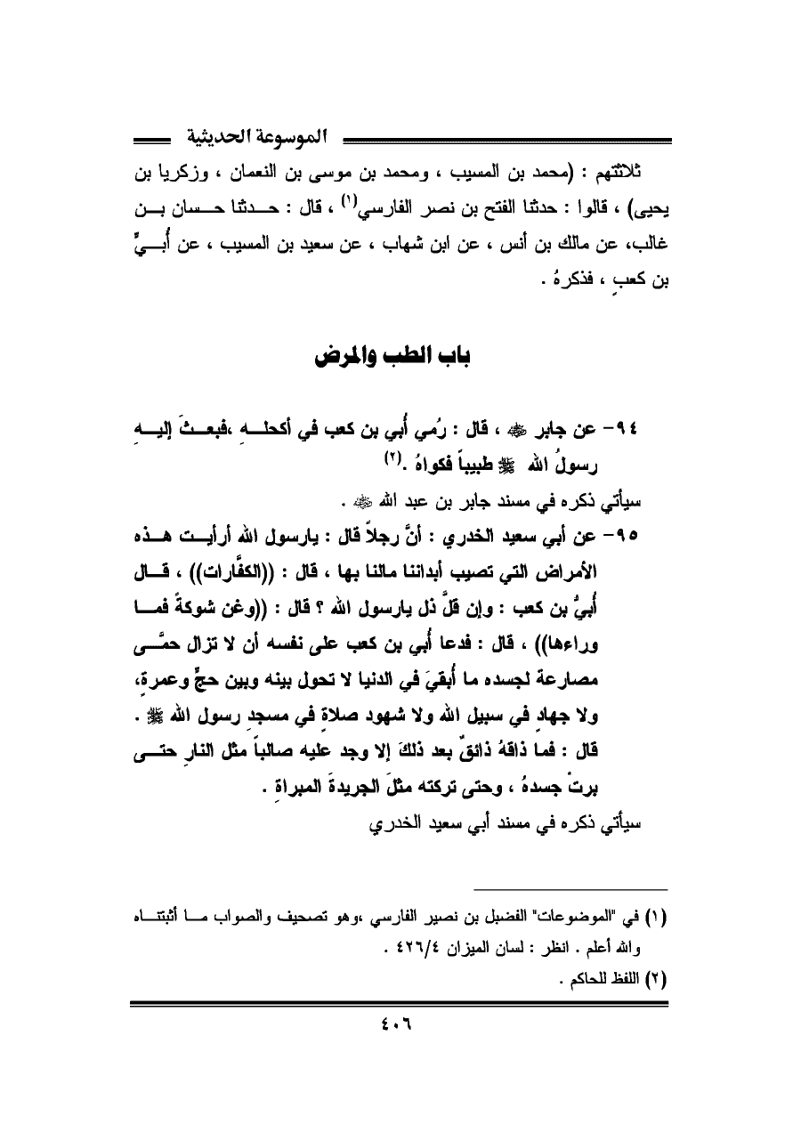 ثلاثتهم: (محمد بن المسيب، ومحمد بن موسى بن النعمان، وزكريا بن يحيى)، قالوا: حدثنا الفتح بن نصر الفارسي (¬١)، قال: حدثنا حسان بن غالب، عن مالك بن أنس، عن ابن شهاب، عن سعيد بن المسيب، عن أَبي بن كعبٍ، فذكرهُ.