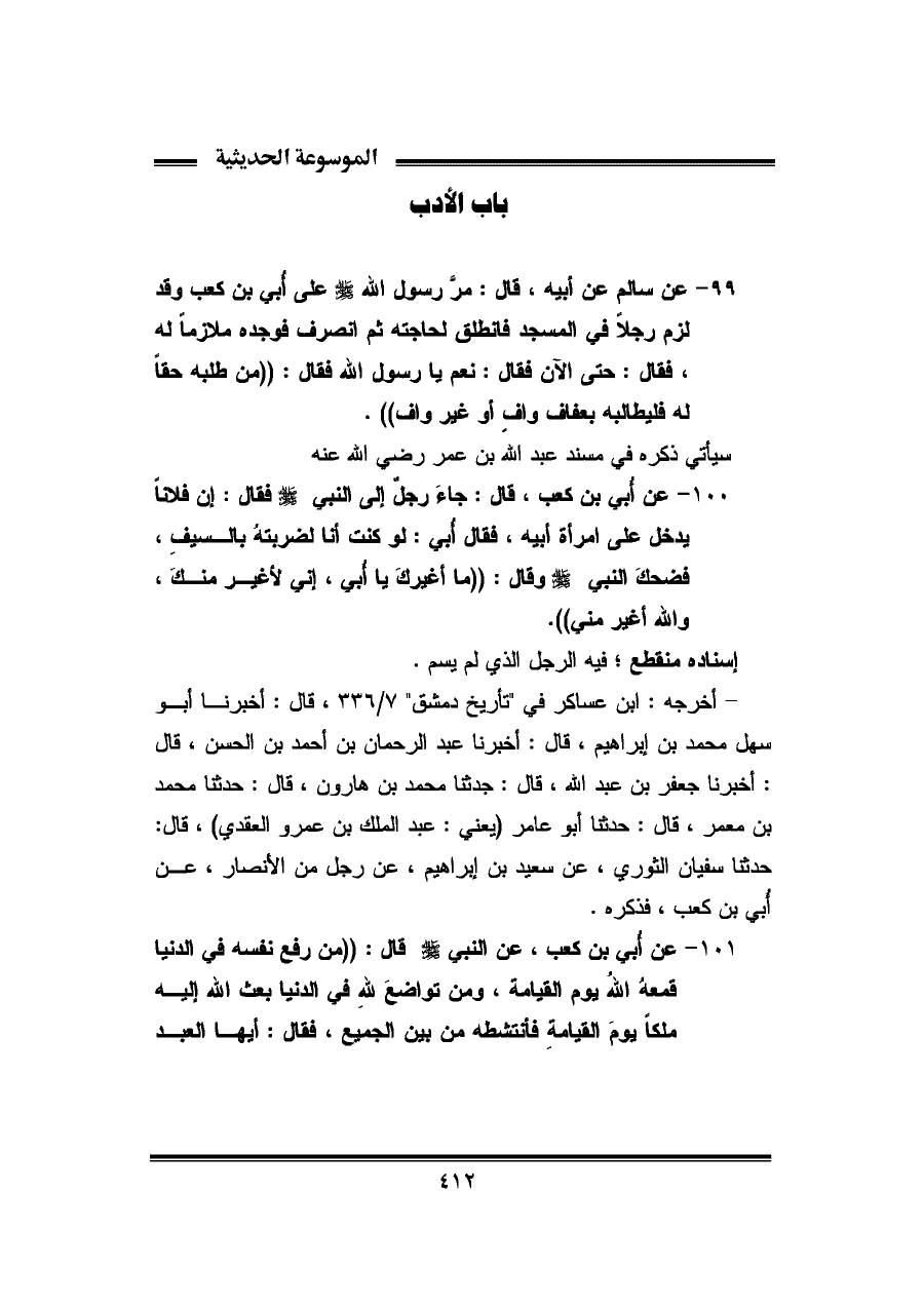 ٩٩ - عن سالم عن أبيه، قال: مرَّ رسول اللّه - صلى الله عليه وسلم - على أُبي بن كعب وقد لزم رجلًا في المسجد فانطلق لحاجته ثم انصرف فوجده ملازمًا له، فقال: حتى الآن فقال: نعم يا رسول الله فقال: "من طلبه حقًا له فليطالبه بعفاف وافٍ أو غير واف".