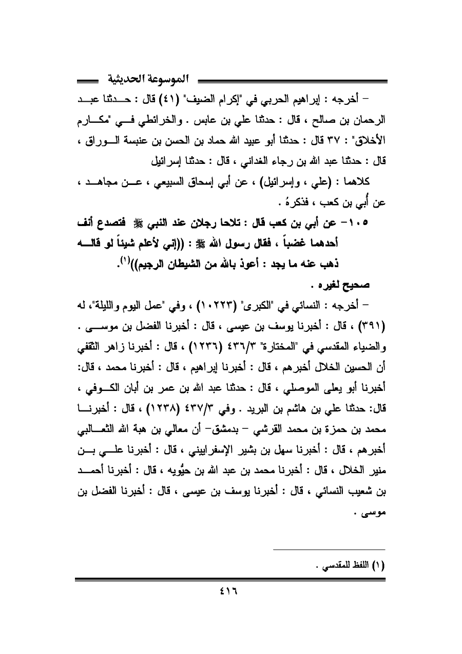 ١٠٥ - عن أبى بن كعب قال: تلاحا رجلان عند النبي - صلى الله عليه وسلم - فتصدع أنف أحدهما غضبًا، فقال رسول اللّه - صلى الله عليه وسلم -: "إني لأعلم شيئًا لو قاله ذهب عنه ما يجد: أعوذ بالله من الشيطان الرجيم)) (¬١).