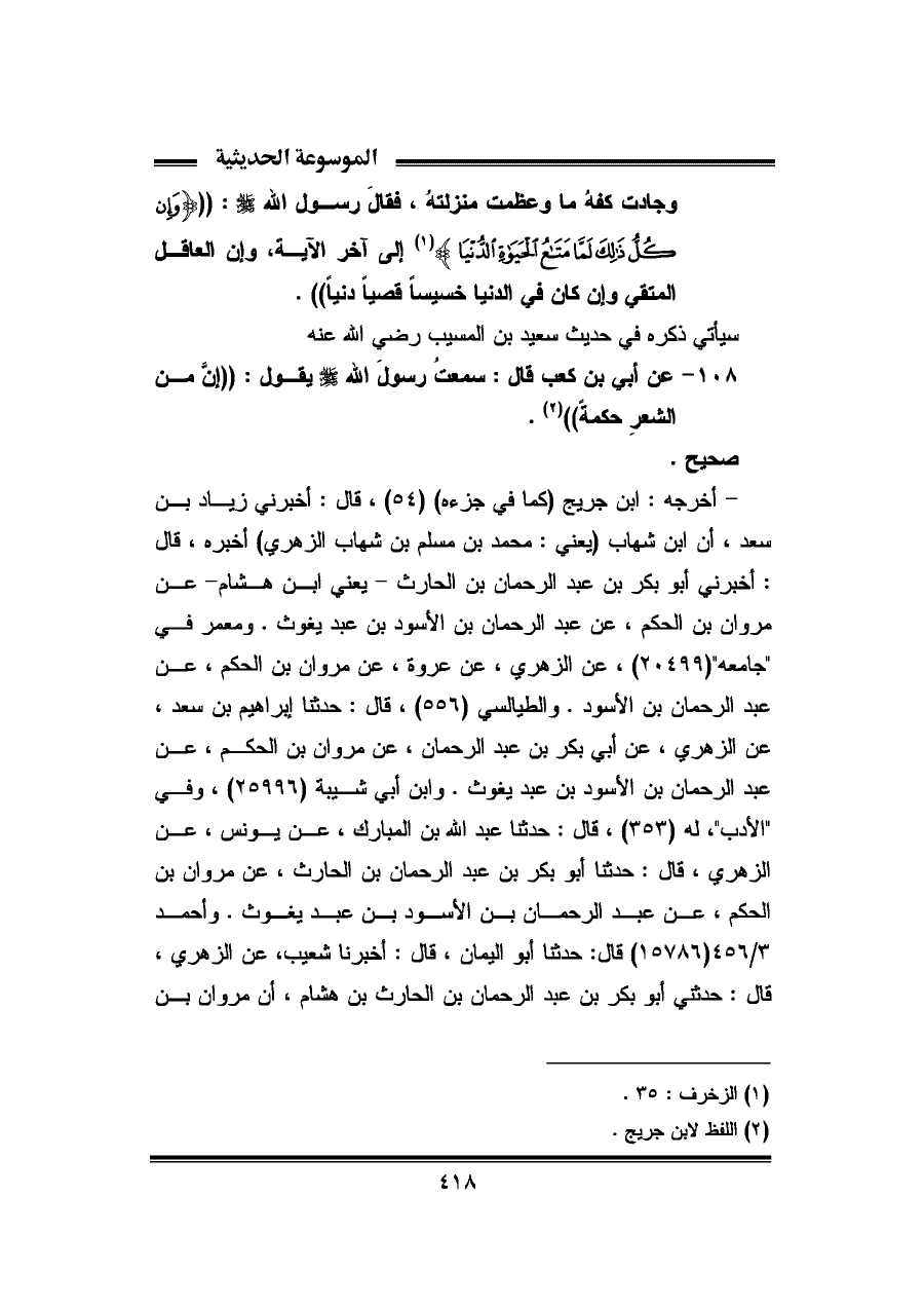 ١٠٨ - عن أُبي بن كعب قال: سمعت رسولَ اللّه - صلى الله عليه وسلم - يقول: "إن من الشعرِ حكمةً" (¬٢).