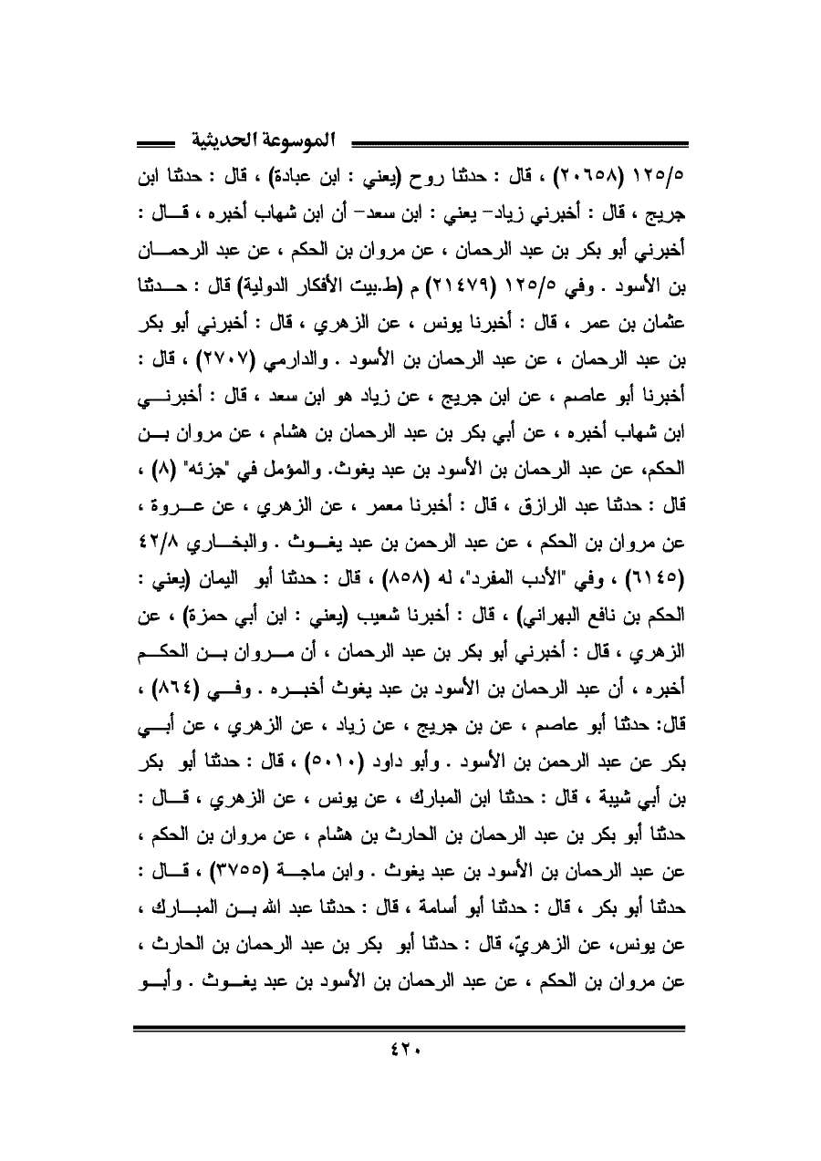 ٥/ ١٢٥ - (٢٠٦٥٨)، قال: حدثنا روح (يعني: ابن عبادة)، قال: حدثنا ابن جريج، قال: أخبرني زياد - يعني: ابن سعد - أن ابن شهاب أخبره، قال: أخبرني أبو بكر بن عبد الرحمان، عن مروان بن الحكم، عن عبد الرحمان بن الأسود. وفي ٥/ ١٢٥ (٢١٤٧٩) م (ط. بيت الأفكار الدولية) قال: حدثنا عثمان بن عمر، قال: أخبرنا يونس، عن الزُّهري، قال: أخبرني أبو بكر بن عبد الرحمان، عن عبد الرحمان بن الأسود. والدارمي (٢٧٠٧)، قال: أخبرنا أبو عاصم، عن ابن جريج، عن زياد هو ابن سعد، قال: أخبرني ابن شهاب أخبره، عن أبي بكر بن عبد الرحمان بن هشام، عن مروان بن الحكم، عن عبد الرحمان بن الأسود بن عبد يغوث. والمؤمل في "جزئه" (٨)، قال: حدثنا عبد الرازق، قال: أخبرنا معمر، عن الزهرى، عن عروة، عن مروان بن الحكم، عن عبد الرحمن بن عبد يغوث. والبخارى ٨/ ٤٢ (٦١٤٥)، وفي "الأدب المفرد"، له (٨٥٨)، قال: حدثنا أبو اليمان (يعني: الحكم بن نافع البهراني)، قال: أخبرنا شعيب (يعنى: ابن أبي حمزة)، عن الزُّهري، قال: أخبرني أبو بكر بن عبد الرحمان، أن مروان بن الحكم أخبره، أن عبد الرحمان بن الأسود بن عبد يغوث أخبره. وفي (٨٦٤)، قال: حدثنا أبو عاصم، عن بن جريج، عن زياد، عن الزُّهري، عن أبي بكر عن عبد الرحمن بن الأسود. وأبو داود (٥٠١٠)، قال: حدثنا أبو بكر بن أبي شيبة، قال: حدثنا ابن المبارك، عن يونس، عن الزُّهري، قال: حدثنا أبو بكر بن عبد الرحمان بن الحارث بن هشام، عن مروان بن الحكم، عن عبد الرحمان بن الأسود بن عبد يغوث. وابن ماجة (٣٧٥٥)، قال: حدثنا أبو بكر، قال: حدثنا أبو أسامة، قال: حدثنا عبد الله بن المبارك، عن يونس، عن الزهريّ، قال: حدثنا أبو بكر بن عبد الرحمان بن الحارث، عن مروان بن الحكم، عن عبد الرحمان بن الأسود بن عبد يغوث. وأبو