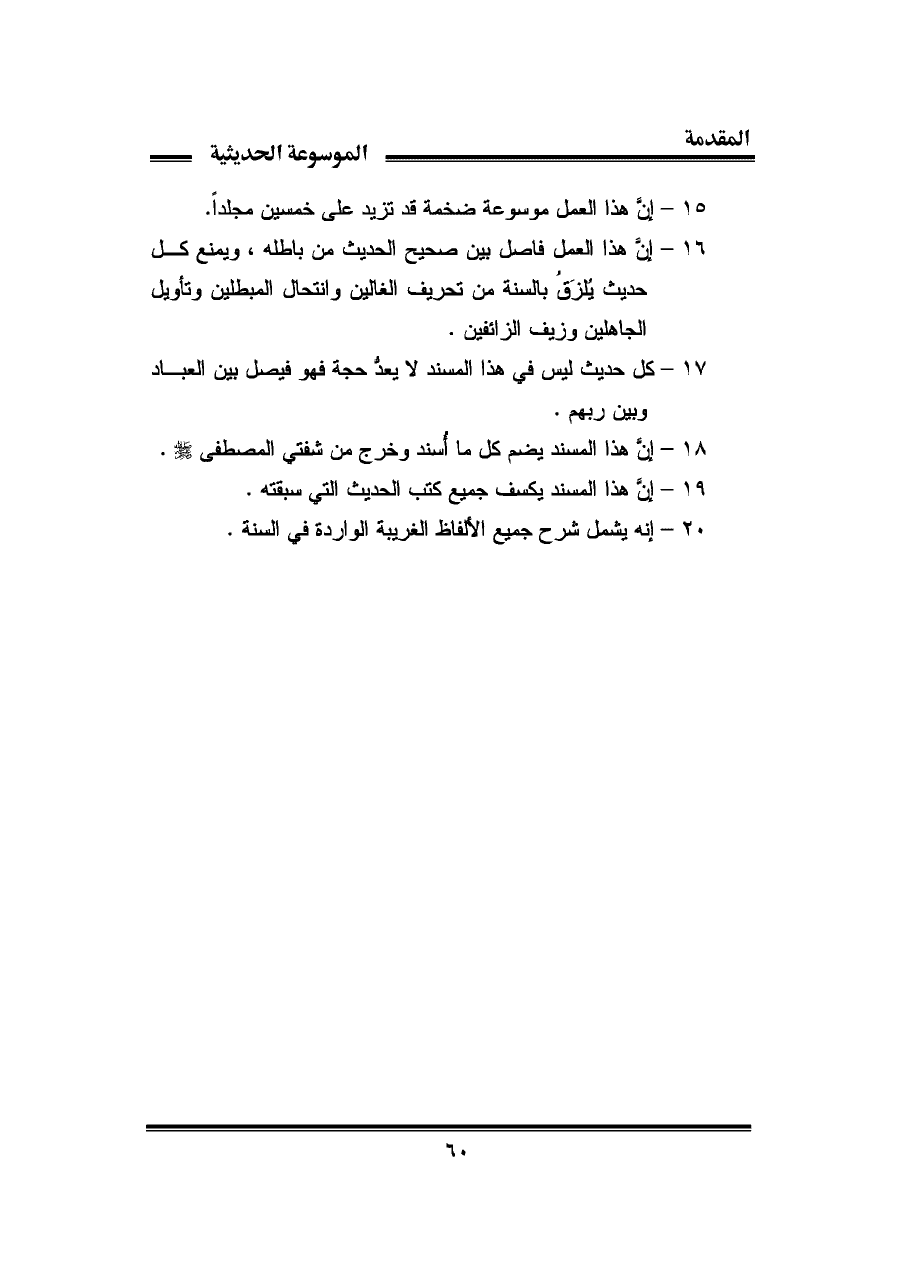 ١٦ - إنَّ هذا العمل فاصل بين صحيح الحديث من باطله، ويمنع كل حديث يُلزَقُ بالسنة من تحريف الغالين وانتحال المبطلين وتأويل الجاهلين وزيف الزائفين.