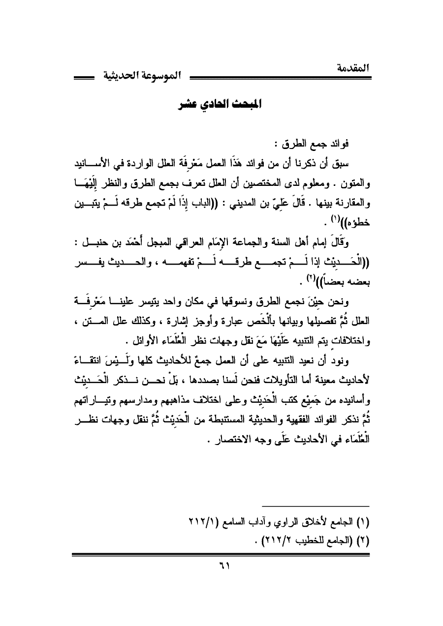 ونحن حِيْنَ نجمع الطرق ونسوقها في مكان واحد يتيسر علينا مَعْرِفَة العلل ثُمّ تفصيلها وبيانها بألْخَص عبارة وأوجز إشارة، وكذلك علل المتن، واختلافات يتم التنبيه علَيْهَا مَعَ نقل وجهات نظر الْعلَمَاء الأوائل.
