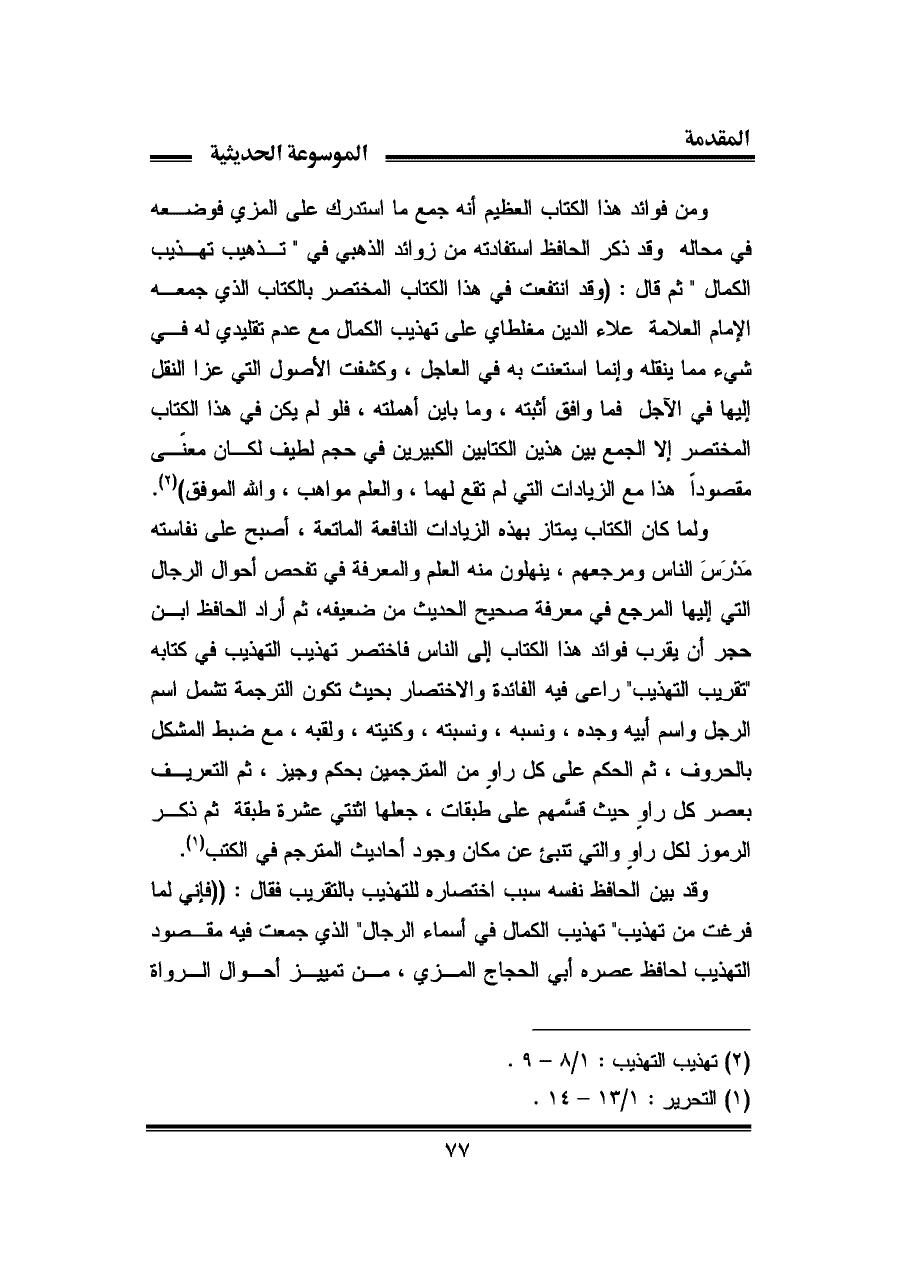 ولما كان الكتاب يمتاز بهذه الزيادات النافعة الماتعة، أصبح على نفاسته مَدْرَسَ الناس ومرجعهم، ينهلون منه العلم والمعرفة في تفحص أحوال الرجال التي إليها المرجع في معرفة صحيح الحديث من ضعيفه، ثم أراد الحافظ ابن حجر أن يقرب فوائد هذا الكتاب إلى الناس فاختصر تهذيب التهذيب في كتابه "تقريب التهذيب" راعى فيه الفائدة والاختصار بحيث تكون الترجمة تشمل اسم الرجل واسم أبيه وجده، ونسبه، ونسبته، وكنيته، ولقبه، مع ضبط المشكل بالحروف، ثم الحكم على كل راوٍ من المترجمين بحكم وجيز، ثم التعريف بعصر كل راو حيث قسَّمهم على طبقات، جعلها اثنتي عشرة طبقة ثم ذكر الرموز لكل راو والتي تنبئ عن مكان وجود أحاديث المترجم في الكتب (¬٢).