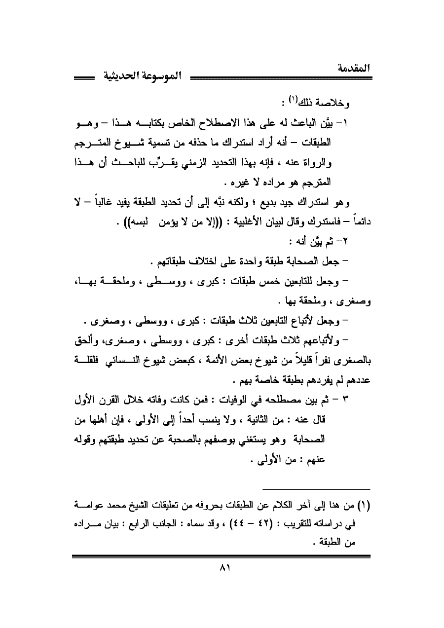 (¬١) من هنا إلى آخر الكلام عن الطبقات بحروفه من تعليقات الشيخ محمد عوامة في دراساته للتقريب: (٤٢ - ٤٤)، وقد سماه: الجانب الرابع: بيان مراده من الطبقة.