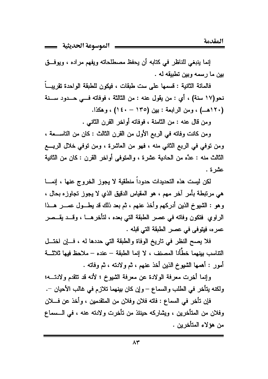 فالمائة الثانية: قسمها على ست طبقات، فيكون للطبقة الواحدة تقريبًا نحو (١٧ سنة)، أى: من يقول عنه: من الثالثة، فوفاته في حدود سنة (١٢٠ هـ)، ومن الرابعة: بين (١٣٥ - ١٤٠)، وهكذا.