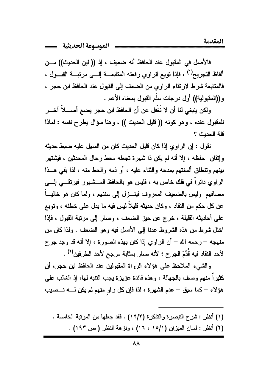فالأصل في المقبول عند الحافظ أنه ضعيف، إذ ((لين الحديث)) من ألفاظ التجريح (¬١)، فإذا توبع الراوي رفعته المتابعة إلى مرتبة القبول، فالمتابعة شرط لارتقاء الراوى من الضعف إلى القبول عند الحافظ ابن حجر، و ((المقبولية)) أول درجات سلّم القبول بمعناه الأعم.
