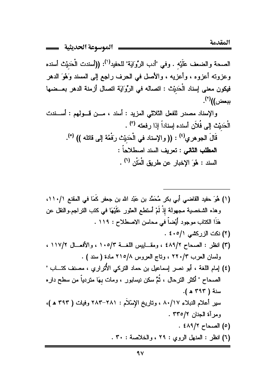 الصحة والضعف علَيْهِ. وفي "أدب الرِّوَايَة" للحفيد (¬١): ((أسندت الْحَدِيْث أسنده وعزوته أعزوه، وأعزيه، والأصل في الحرف راجع إلى المسند وَهُوَ الدهر فيكون معنى إسناد الْحَديْث: اتصاله في الرِّوَايَة اتصال أزمنة الدهر بعضها ببعض)) (¬٢).