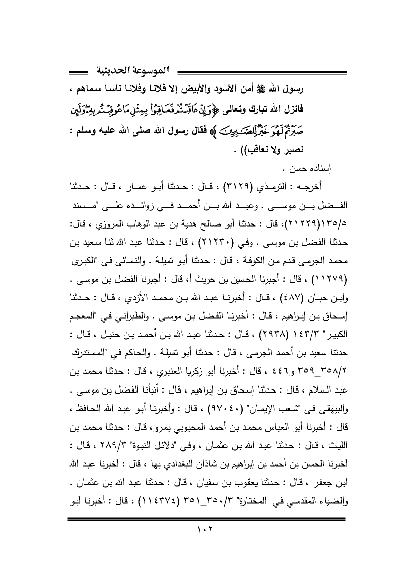 رسول الله - صلى الله عليه وسلم - أمن الأسود والأبيض إلا فلانا وفلانا ناسا سماهم، فأنزل الله تبارك وتعالى {وَإِنْ عَاقَبْتُمْ فَعَاقِبُوا بِمِثْلِ مَا عُوقِبْتُمْ بِهِ وَلَئِنْ صَبَرْتُمْ لَهُوَ خَيْرٌ لِلصَّابِرِينَ} فقال رسول الله صلى الله عليه وسلم: نصبر ولا نعاقب".